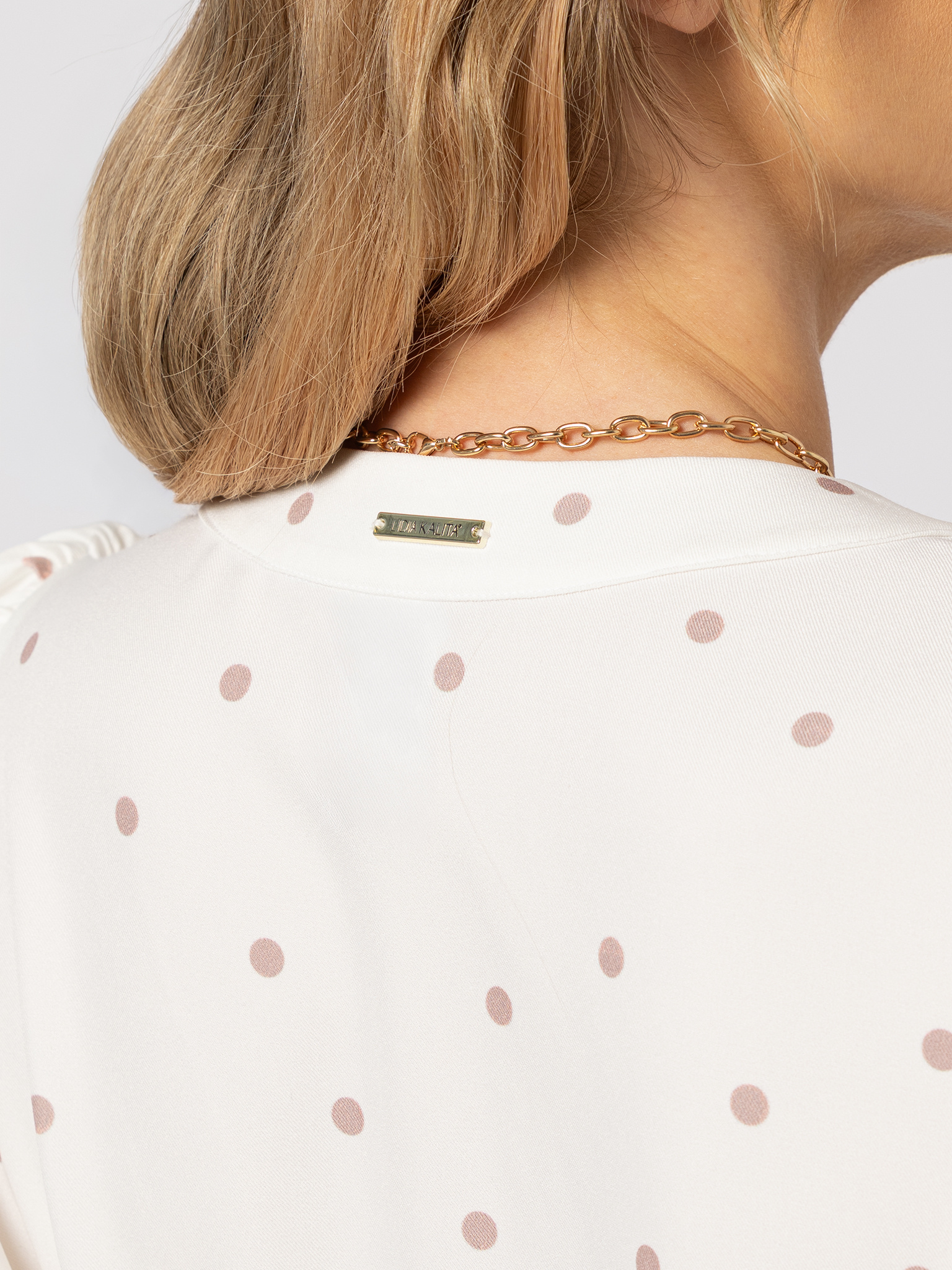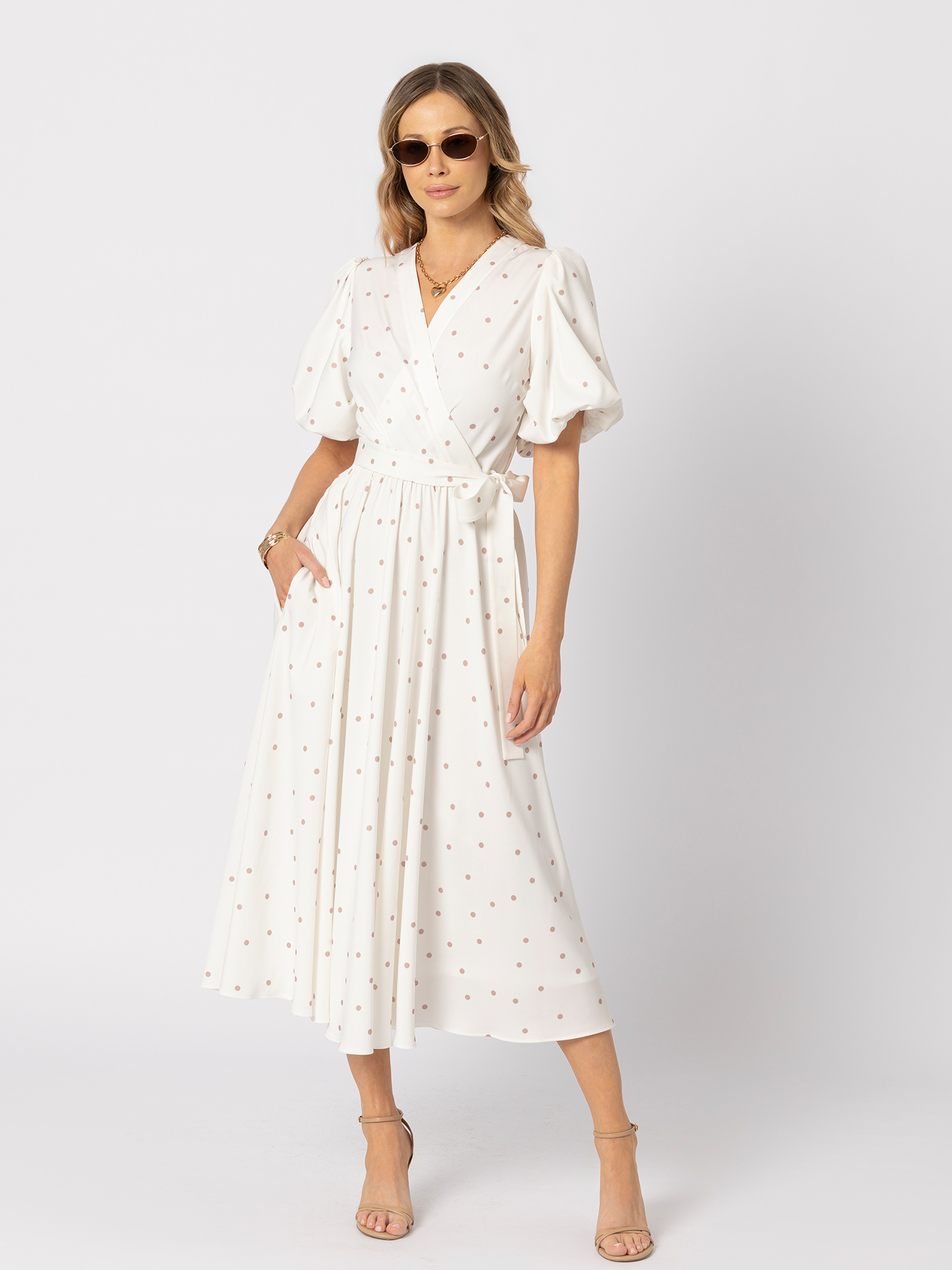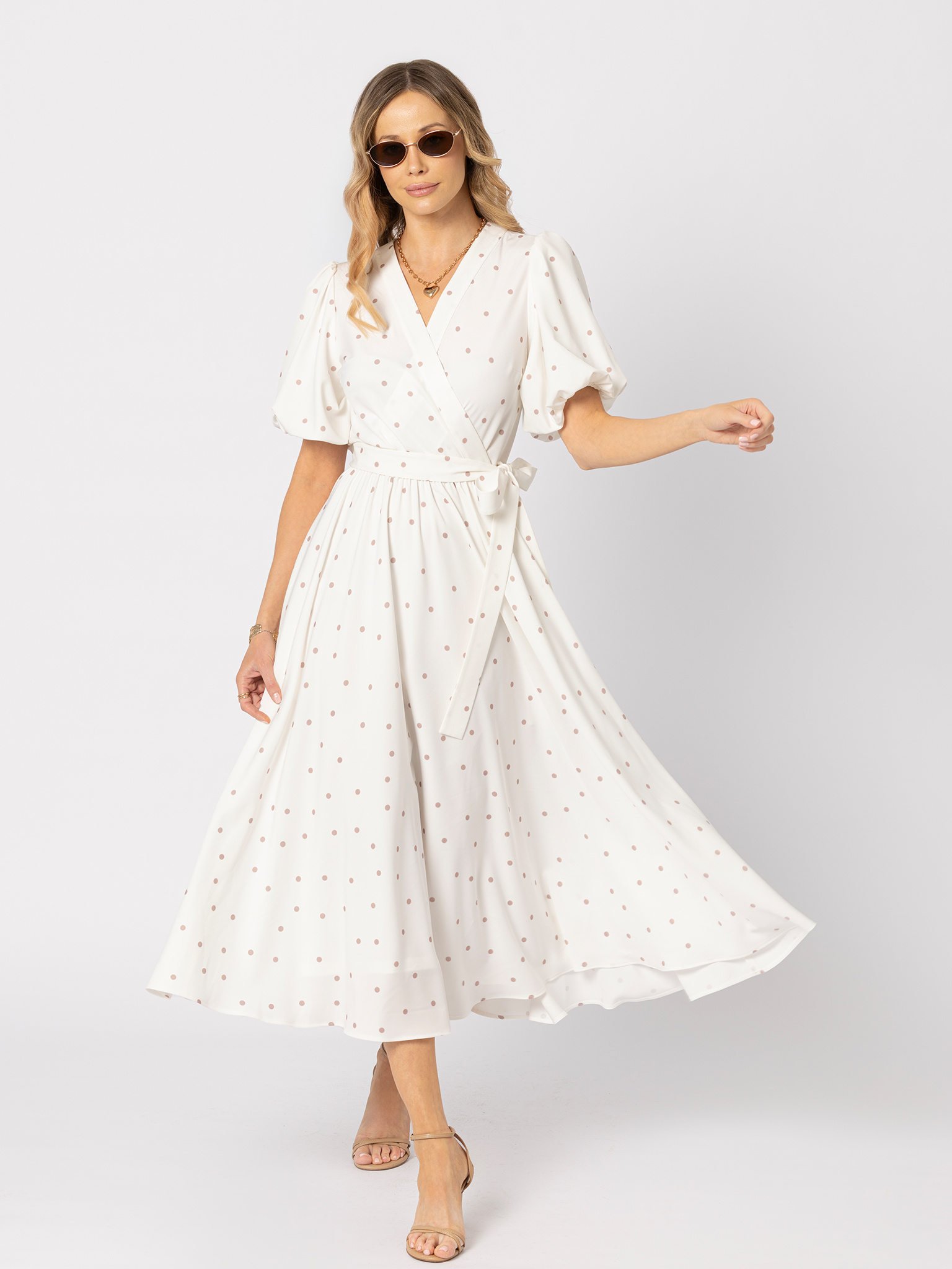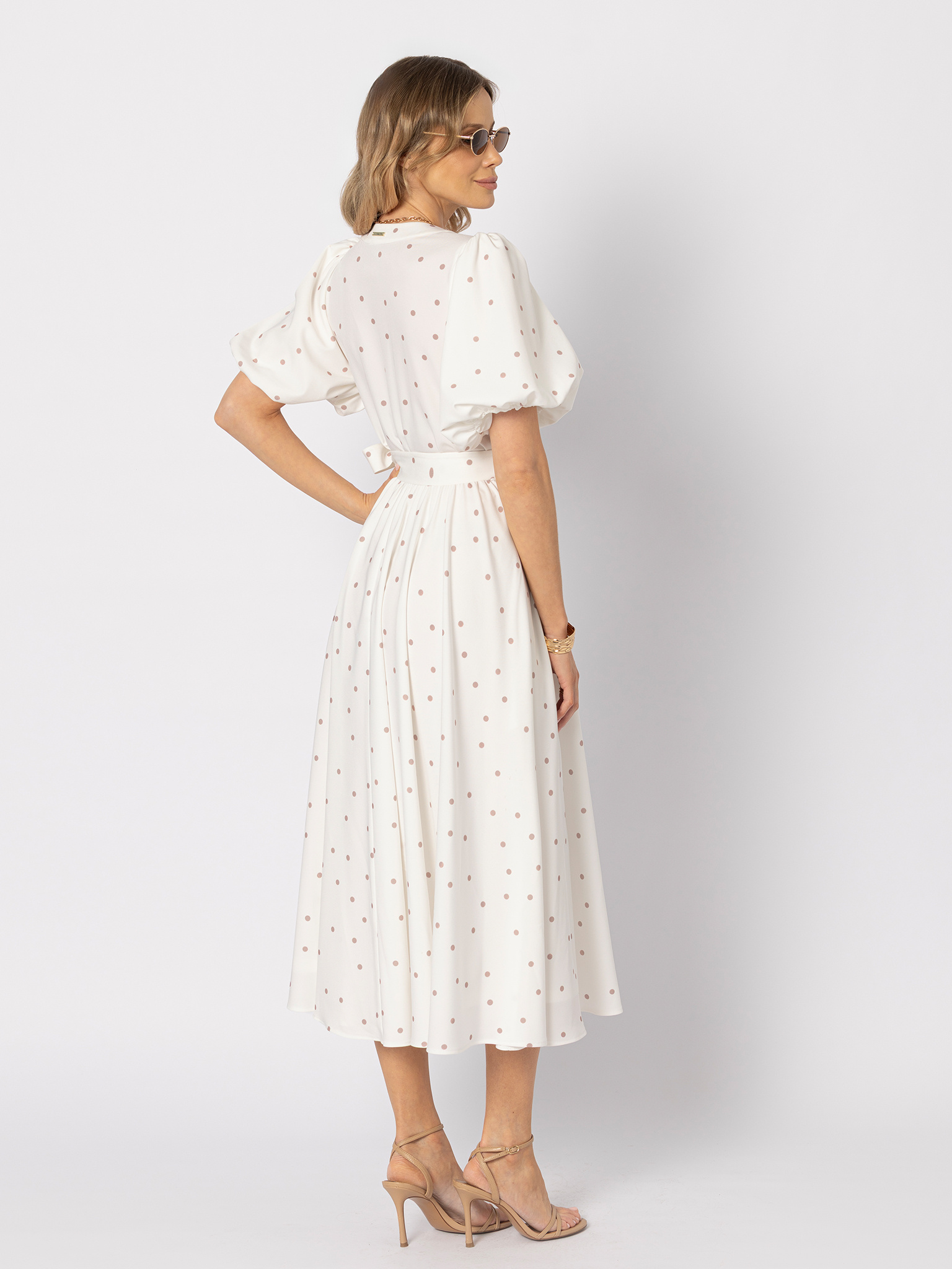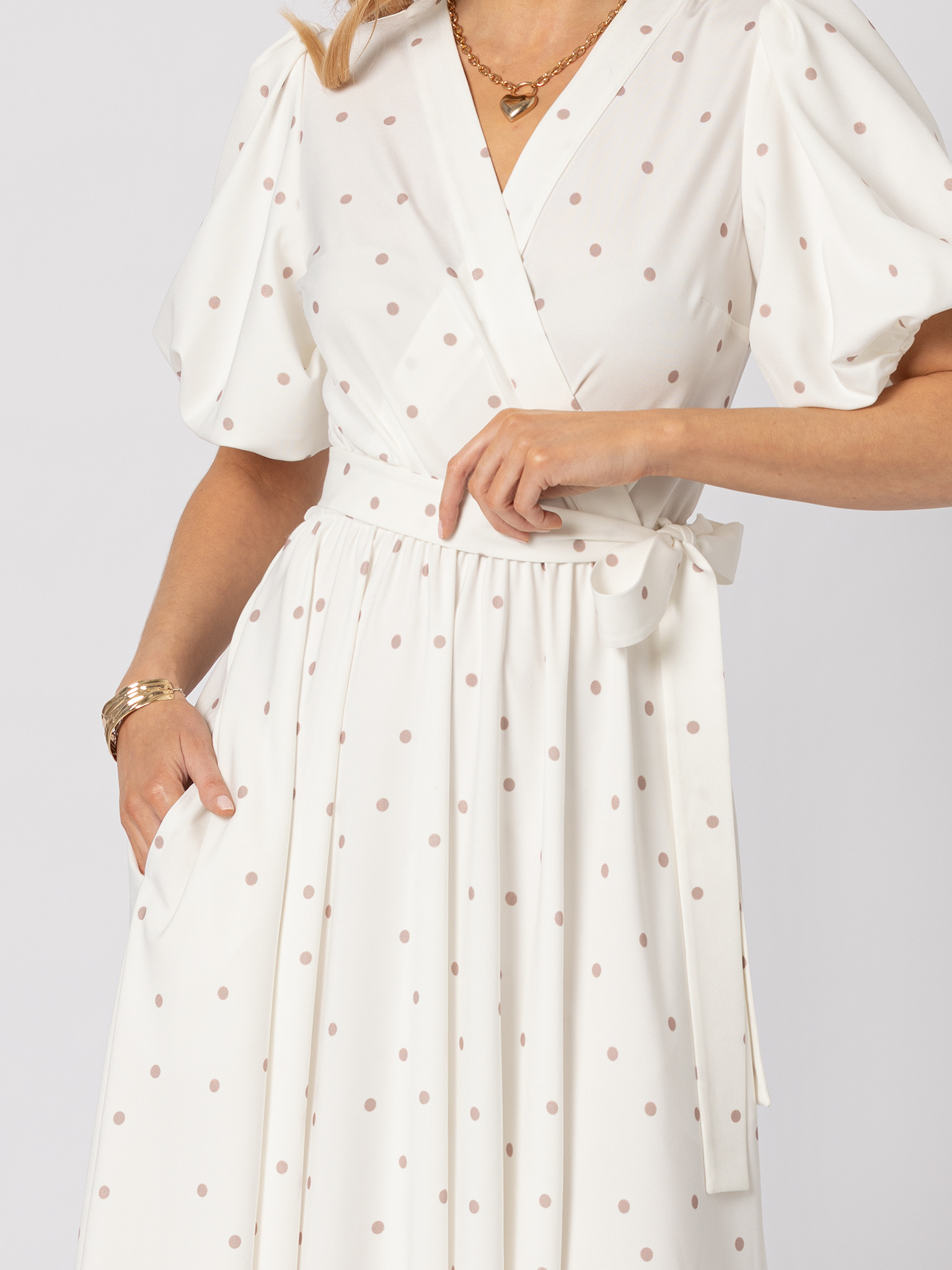 Biała sukienka z beżowe kropki