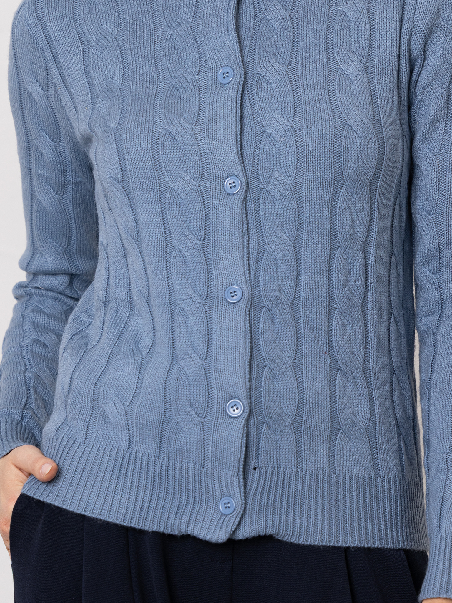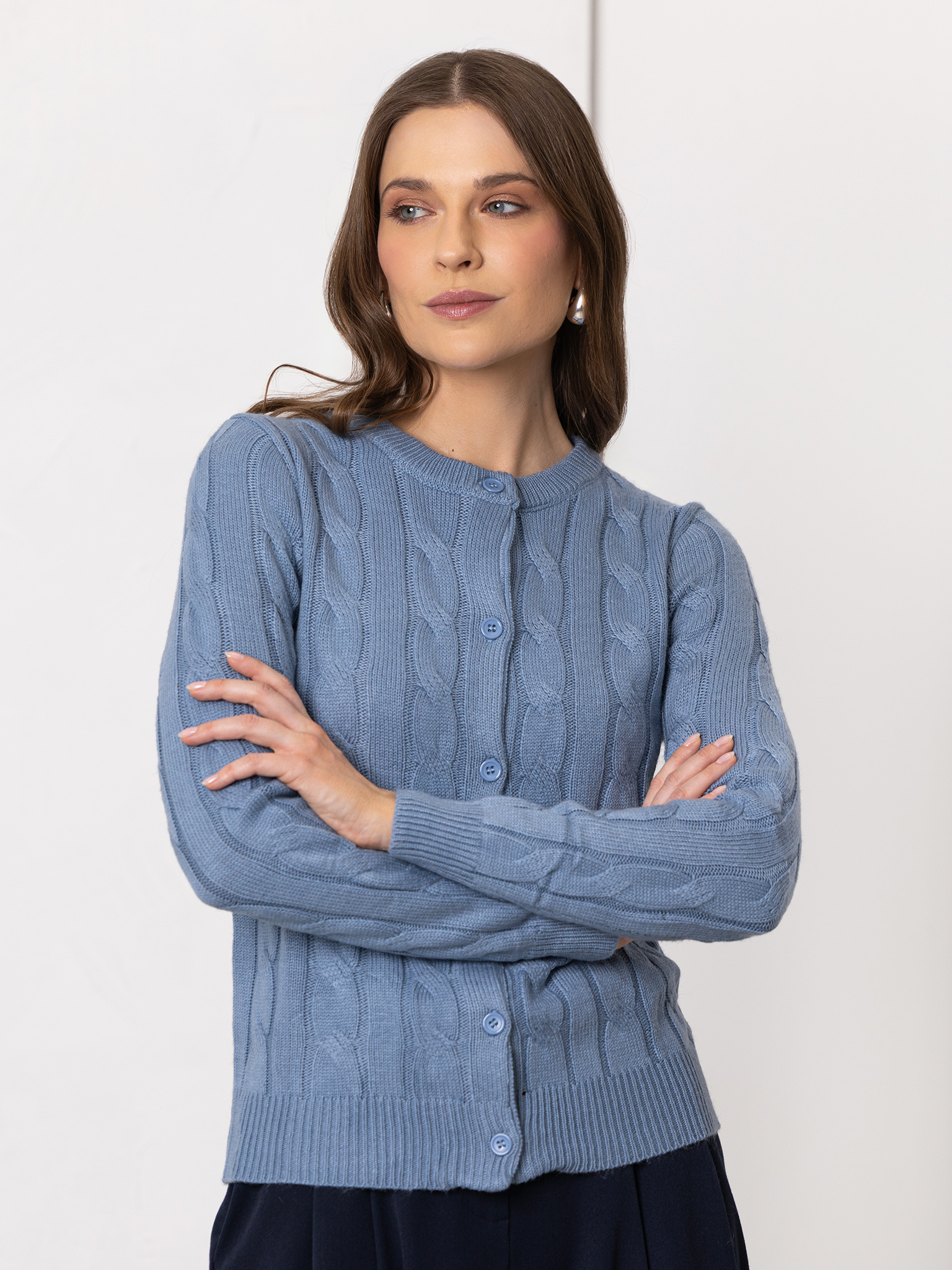 Model wyróżnia się dekoracyjnym, warkoczowym splotem biegnącym wzdłuż kardiganu, który dodaje całości subtelnej struktury i szlachetnego charakteru. Zapięcie na guziki z przodu pozwala nosić go zarówno klasycznie, jak i w bardziej nonszalanckiej formie — rozpięty na top lub zapinany jako samodzielna bluzka.