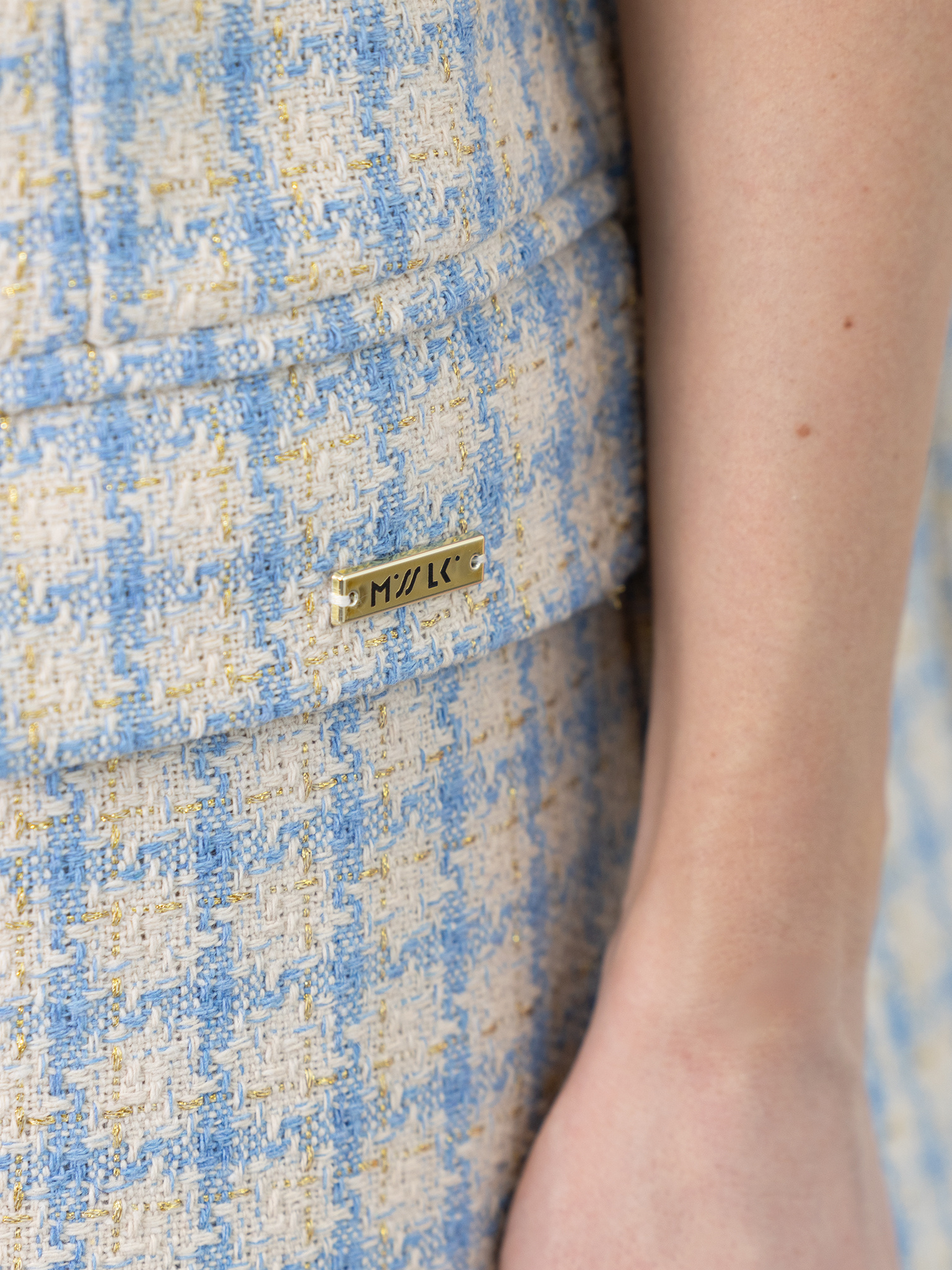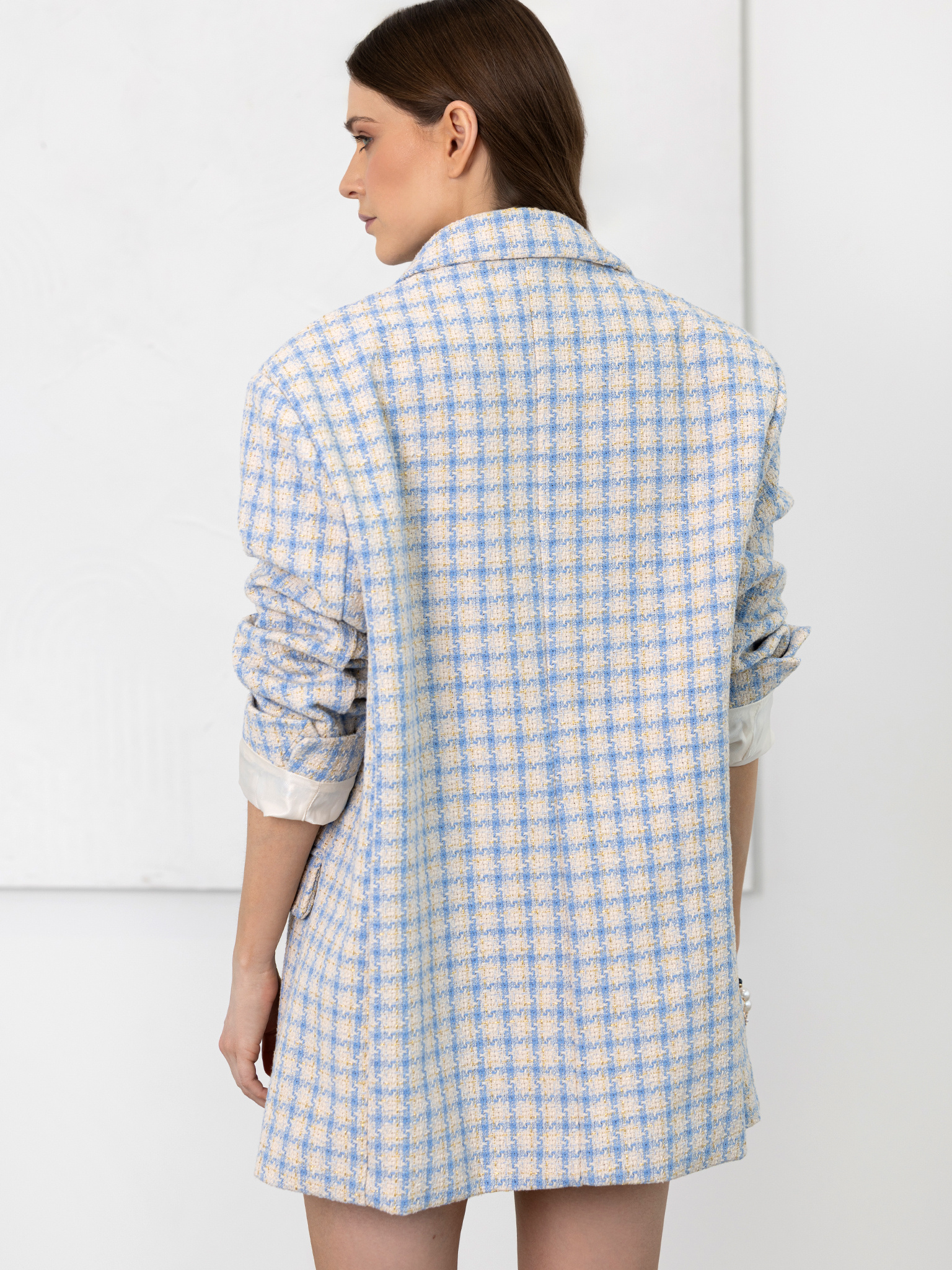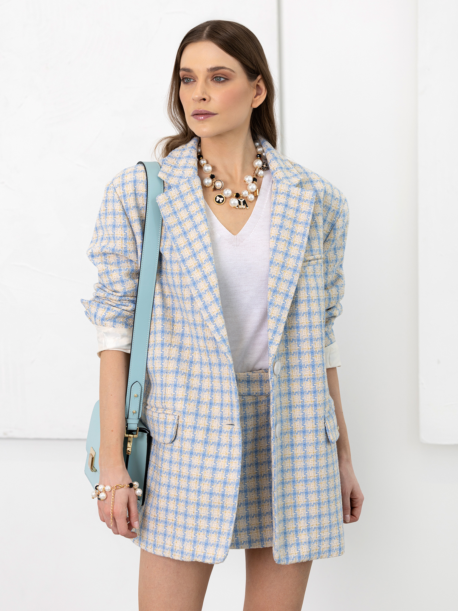 To marynarka, która świetnie sprawdzi się jako baza wielu stylizacji — od eleganckich po bardziej casualowe. Najlepiej prezentuje się w zestawie ze spódnico-szortami w pepitkę, tworząc spójny, dopracowany komplet, ale równie efektownie wygląda noszona solo z białą koszulą lub T-shirtem i prostymi spodniami.