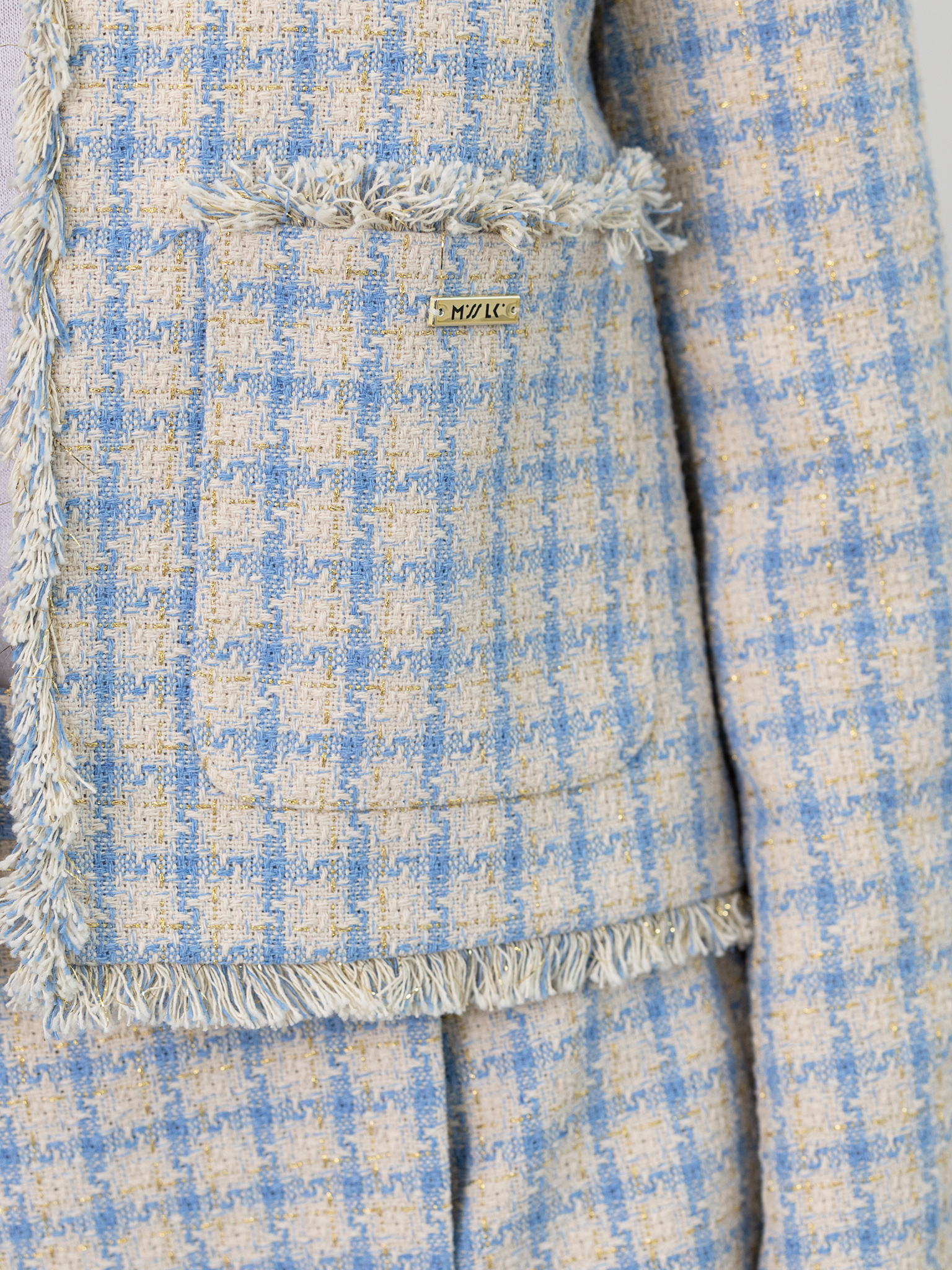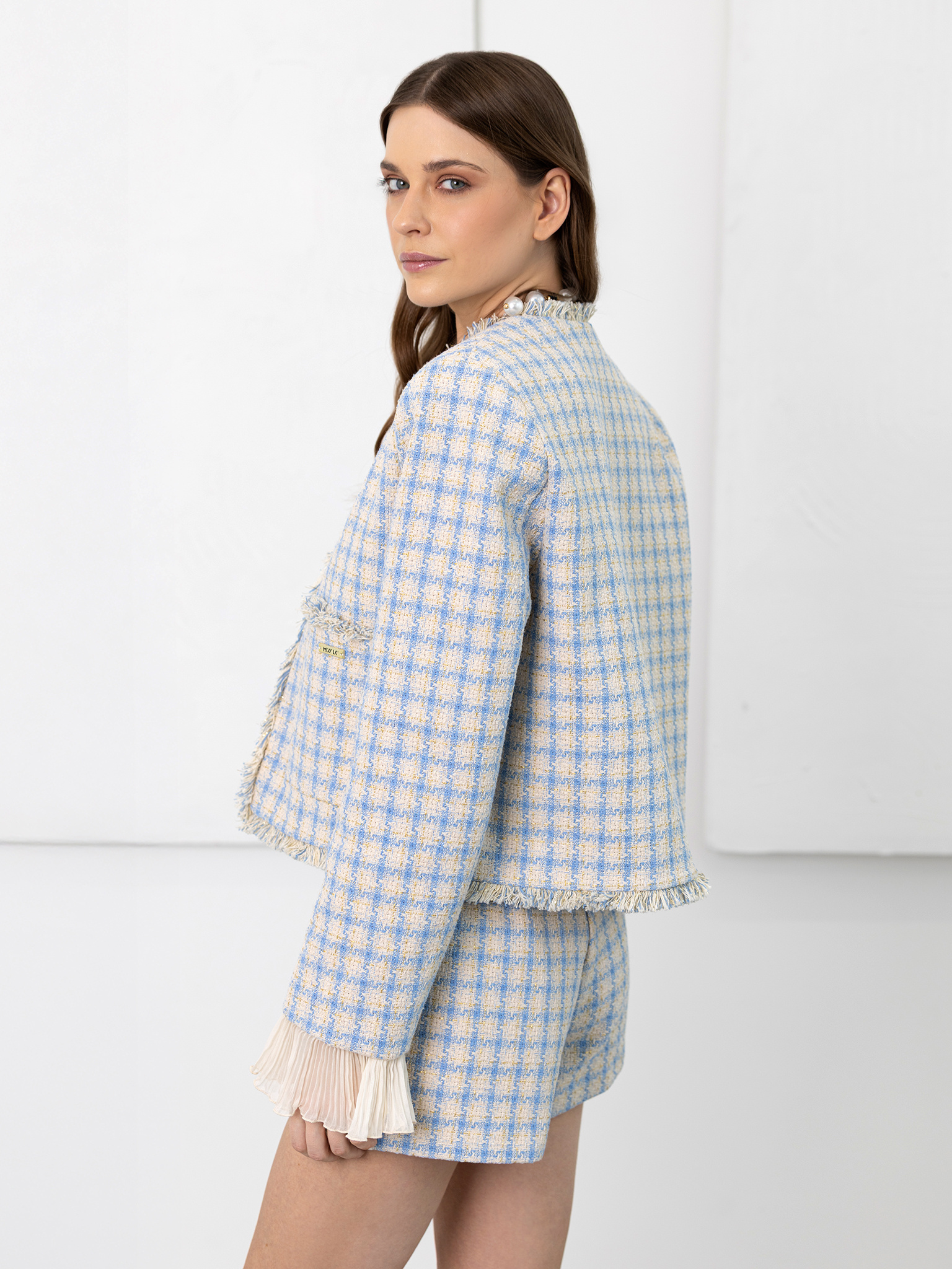 Marynarka w pepitkę z ozdobnym rękawem niebieska ecru