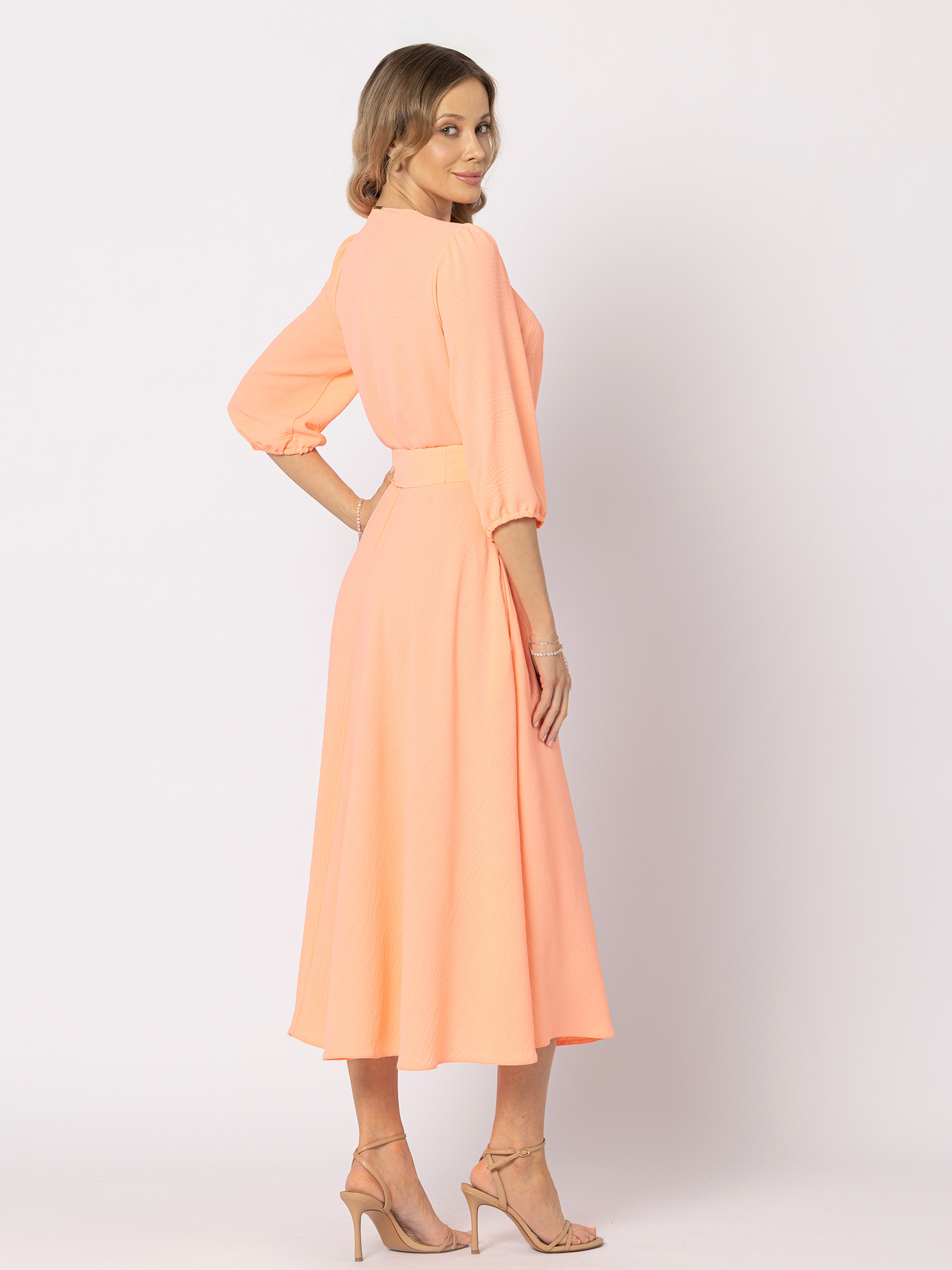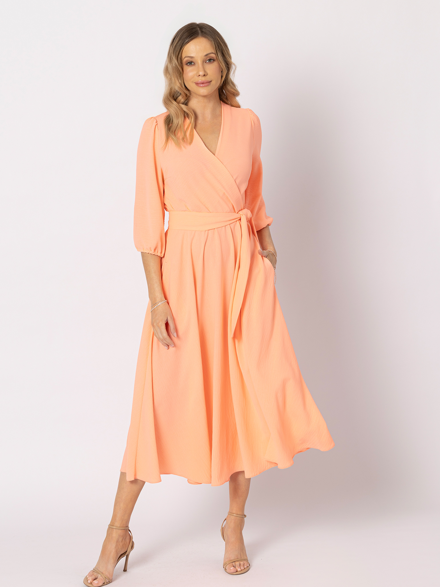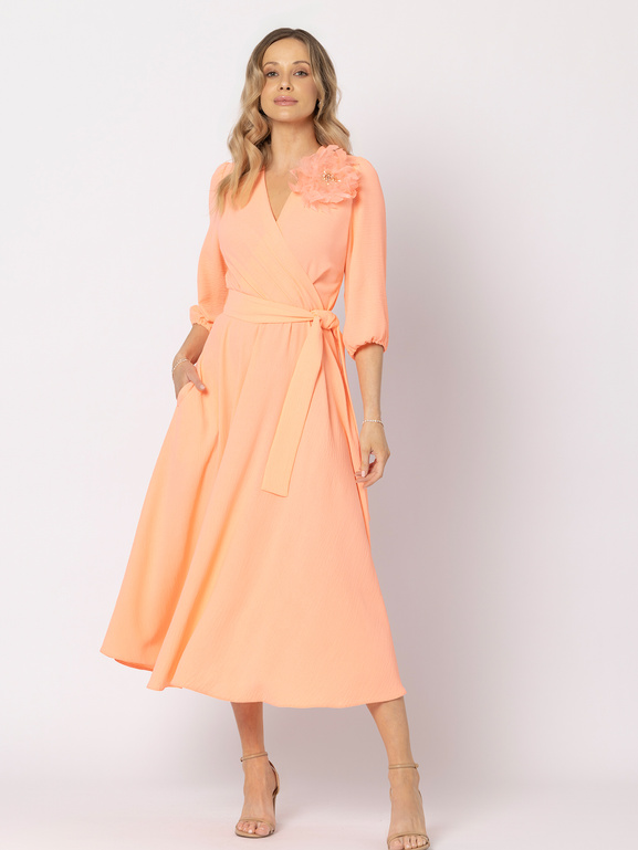 Wykonana z miękkiej, przyjemnej w dotyku tkaniny, pięknie układa się na sylwetce, a rozkloszowany dół o długości midi dodaje lekkości i kobiecego ruchu. Kopertowy dekolt wysmukla górę sylwetki, a gumka w talii w połączeniu z paskiem pozwala podkreślić kobiece kształty — subtelnie lub bardziej zdecydowanie, wiążąc pasek na płasko albo w dekoracyjną kokardę.