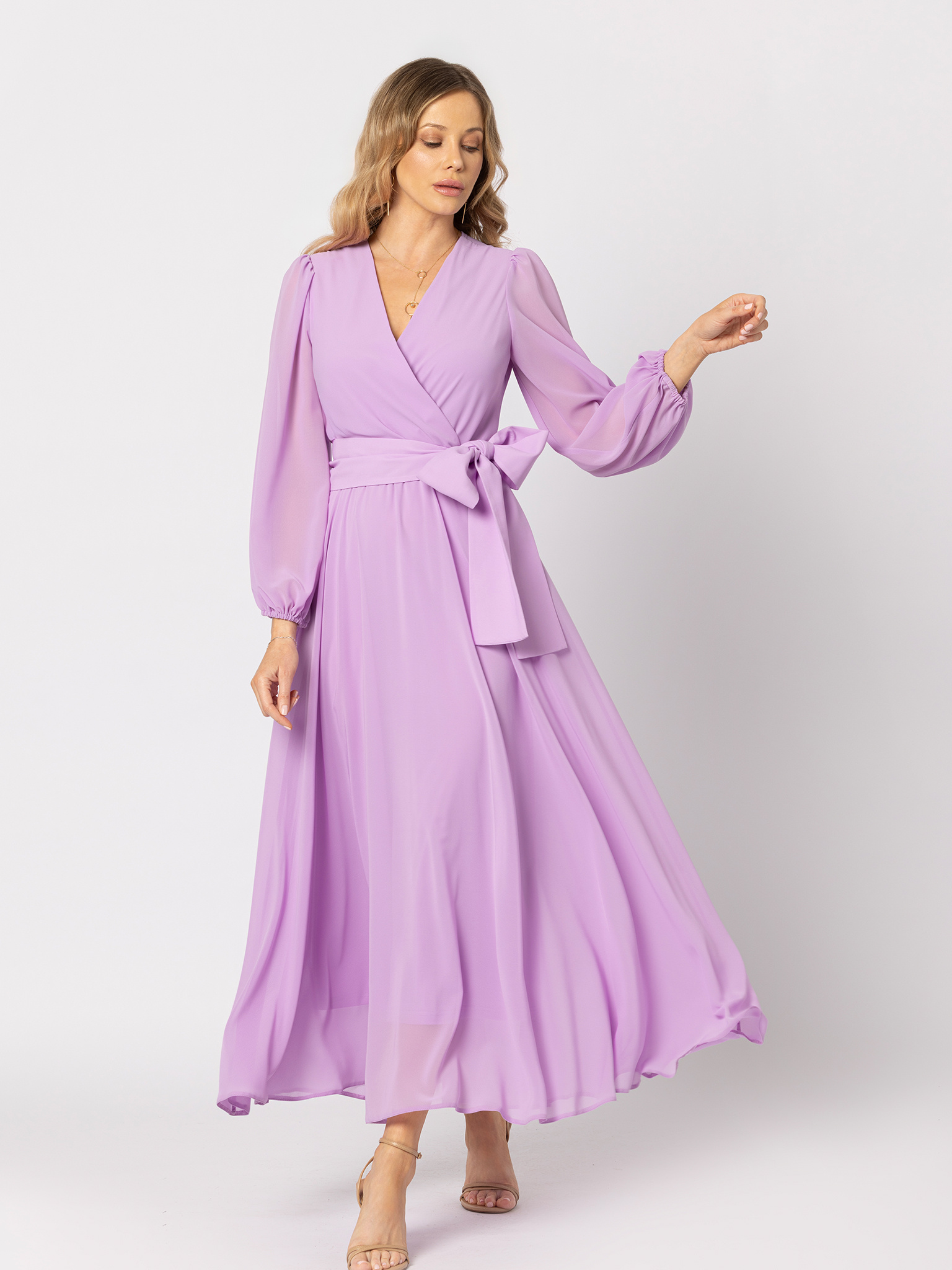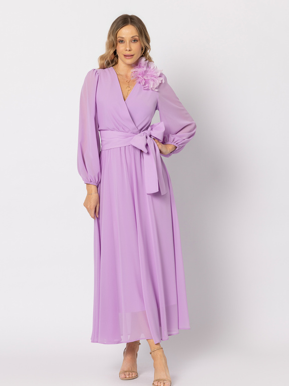 Delikatny, lekko przezroczysty szyfon w szlachetnym odcieniu lawendowego fioletu pięknie pracuje w ruchu, otulając sylwetkę lekkością. Kopertowy dekolt wysmukla linię szyi i podkreśla biust, a gumka w talii wraz z szerokim paskiem do wiązania pozwala idealnie dopasować sukienkę do sylwetki i zaakcentować talię elegancką kokardą.