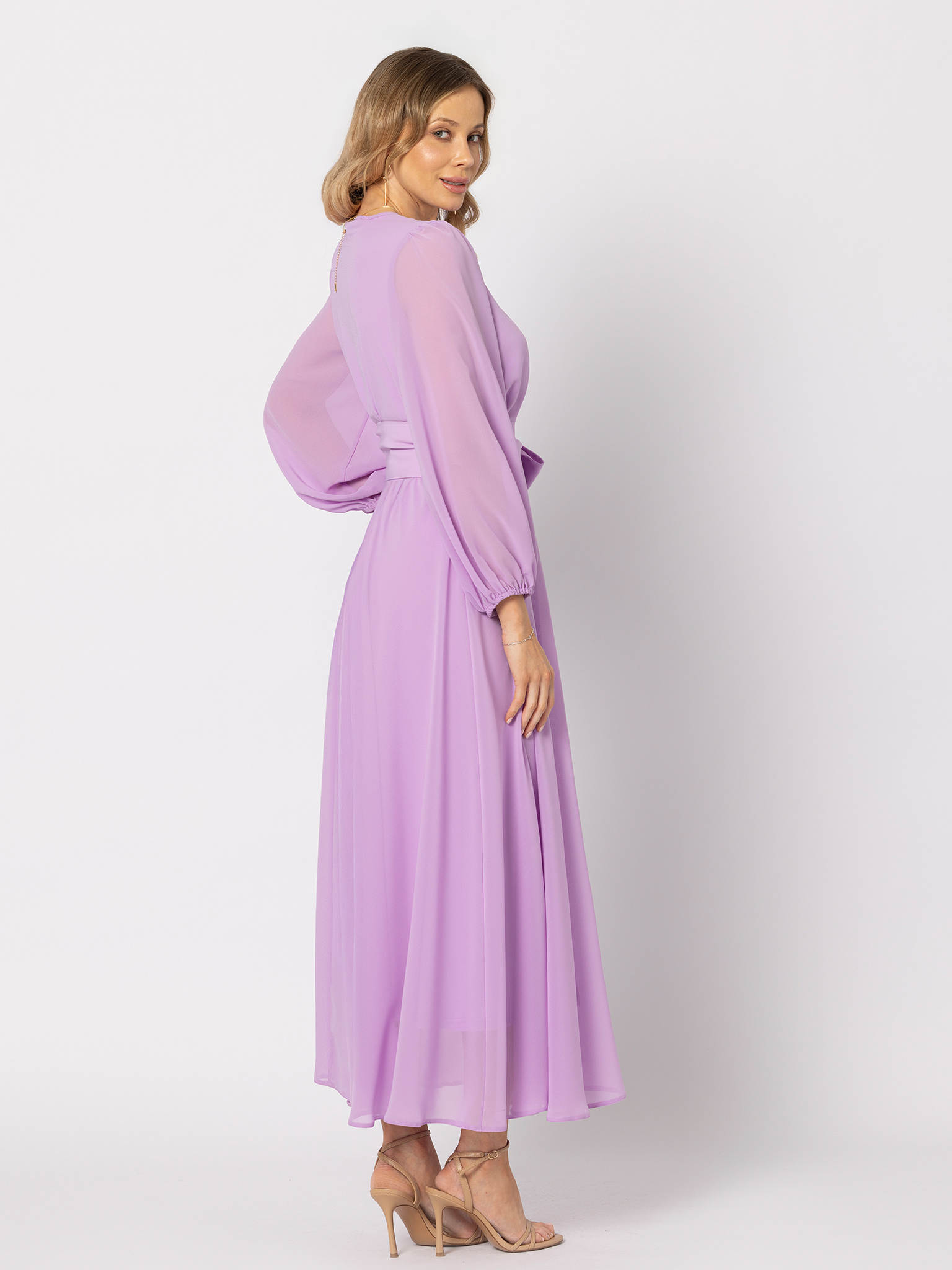 - Sukienka, w której wchodzisz jak gwiazda — spokojnie, pewnie, bez potrzeby udowadniania czegokolwiek. Delikatny, lekko przezroczysty szyfon w szlachetnym odcieniu lawendowego fioletu pięknie pracuje w ruchu, otulając sylwetkę lekkością.