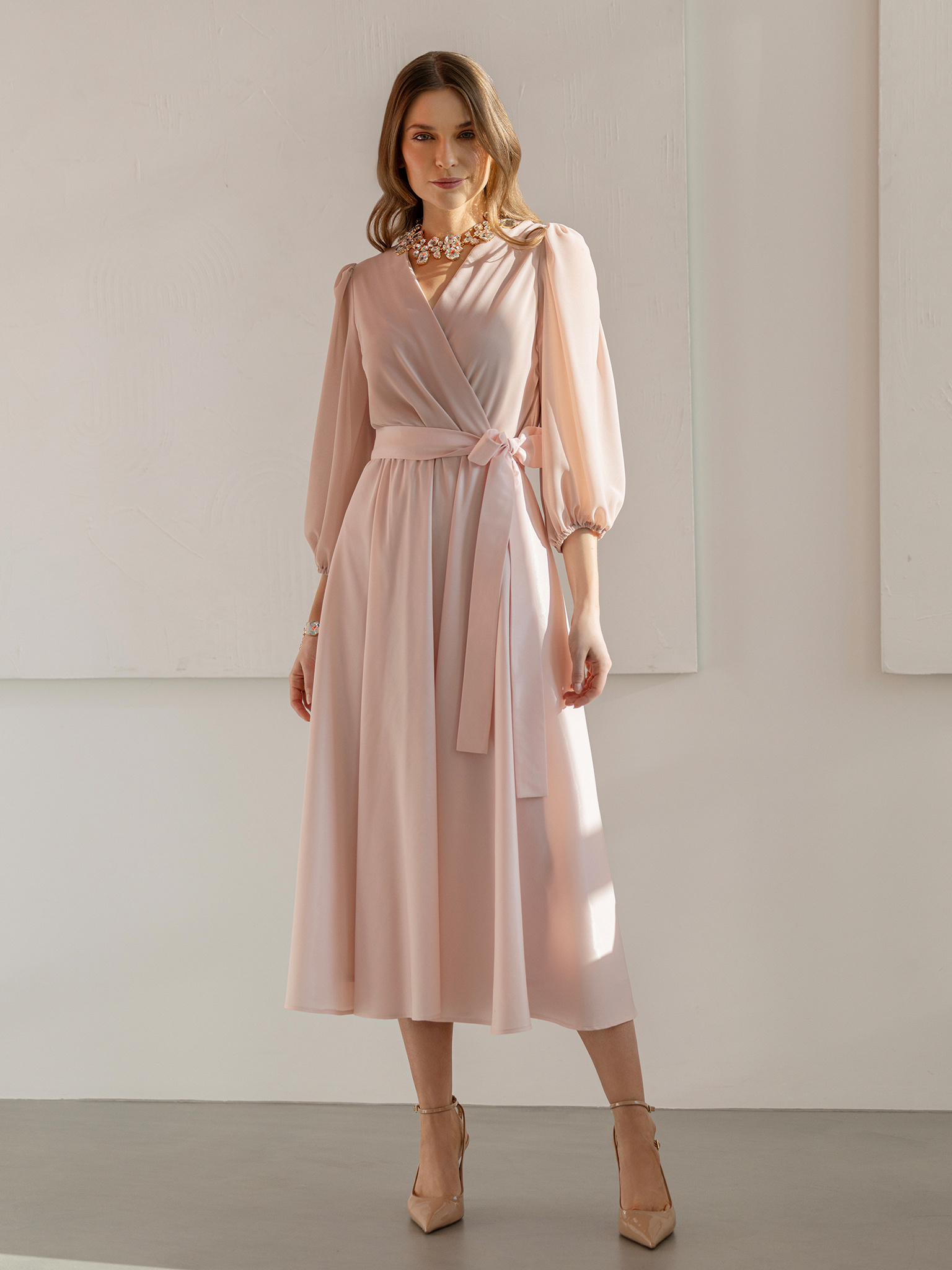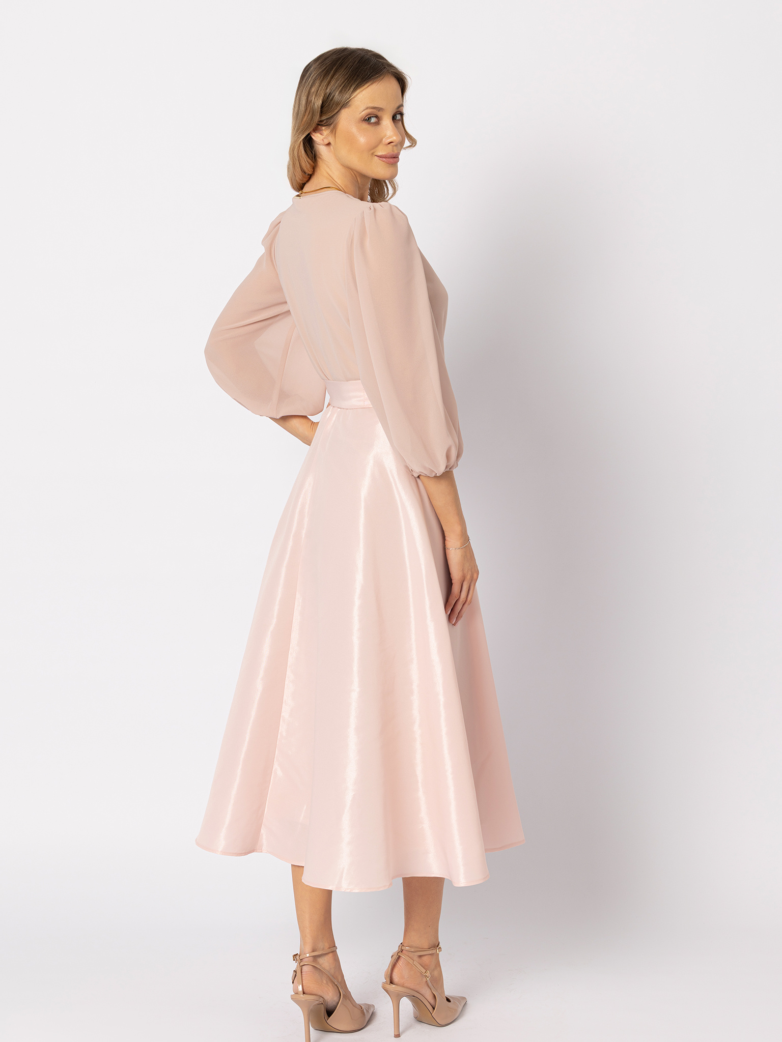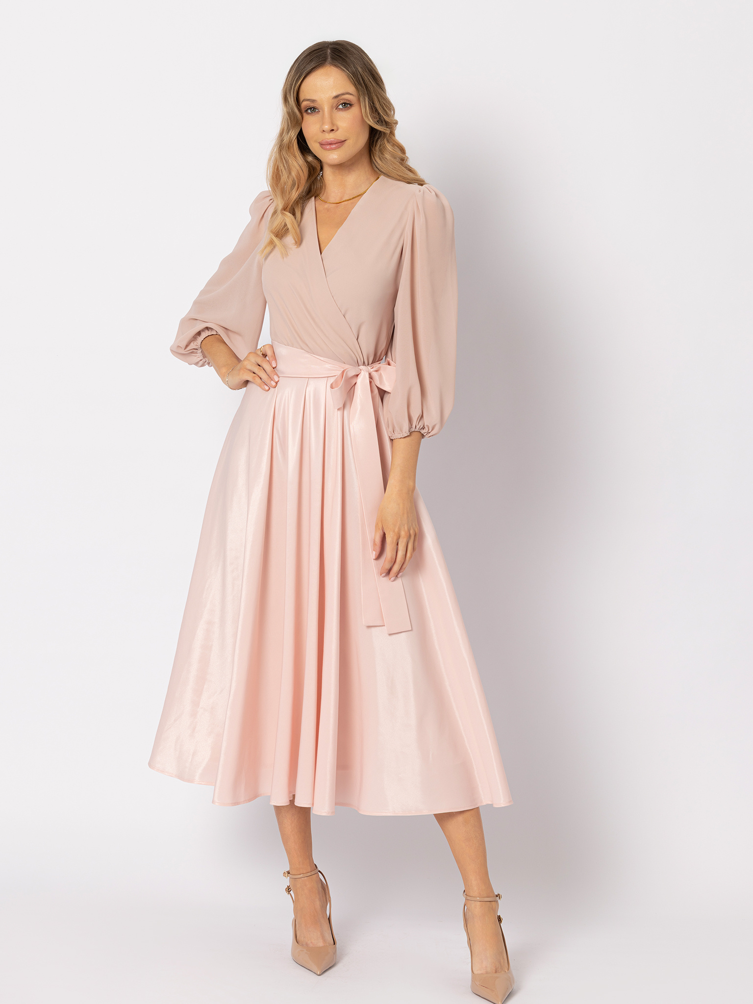 Sukienka z tafty z wiązaniem pudrowy róż