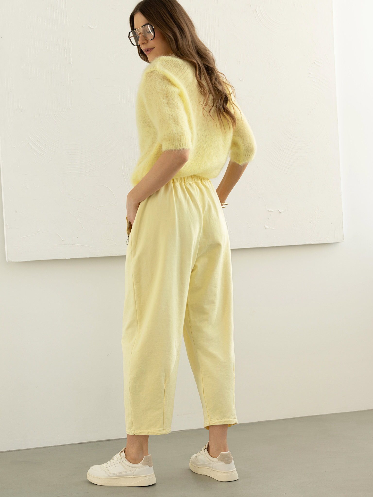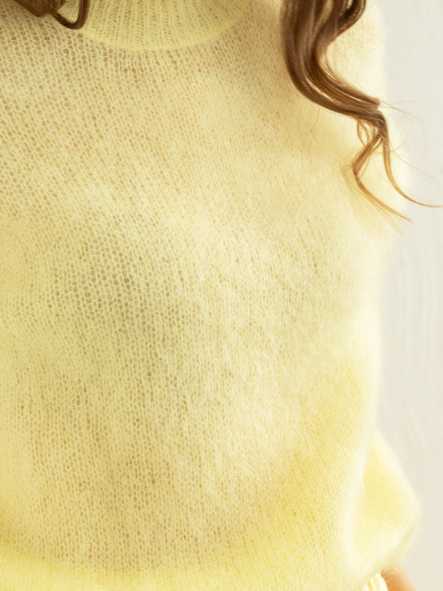 • Miękka, moherowa dzianina jest przyjemna dla skóry i pięknie układa się na sylwetce. Krótki rękaw dodaje lekkości. Pastelowy żółty rozświetla stylizację.