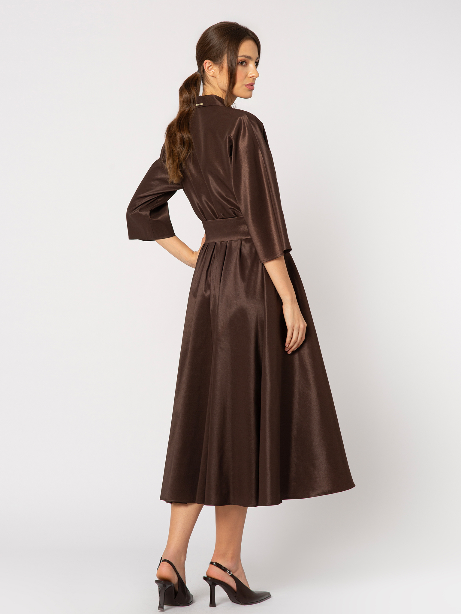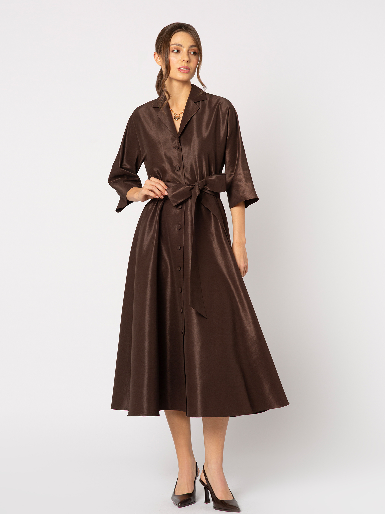 Poczuj się jak ikona mody w sukience Charlotte od Lidii Kality, inspirowanej ponadczasowym stylem Diora z lat 50. Wykonana z luksusowej tafty w odcieniu gorzkiej czekolady, zachwyca subtelnym połyskiem i szlachetnością tkaniny. Ten głęboki, wyrafinowany kolor podkreśla urodę i doskonale wpisuje się w jesienno-zimowe stylizacje, emanują elegancją, która nigdy nie wychodzi z mody.