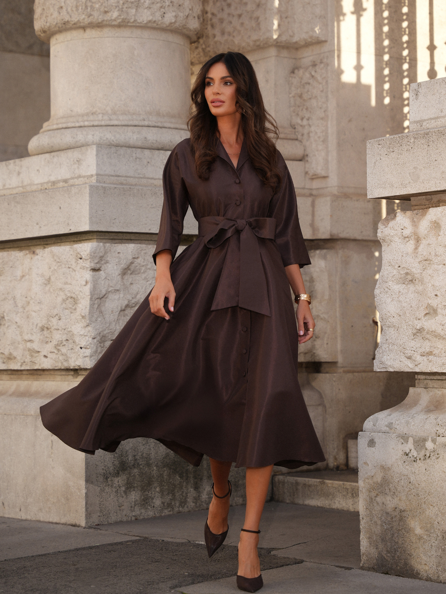 Poczuj się jak ikona mody w sukience Charlotte od Lidii Kality, inspirowanej ponadczasowym stylem Diora z lat 50. Wykonana z luksusowej tafty w odcieniu gorzkiej czekolady, zachwyca subtelnym połyskiem i szlachetnością tkaniny. Ten głęboki, wyrafinowany kolor podkreśla urodę i doskonale wpisuje się w jesienno-zimowe stylizacje, emanują elegancją, która nigdy nie wychodzi z mody.