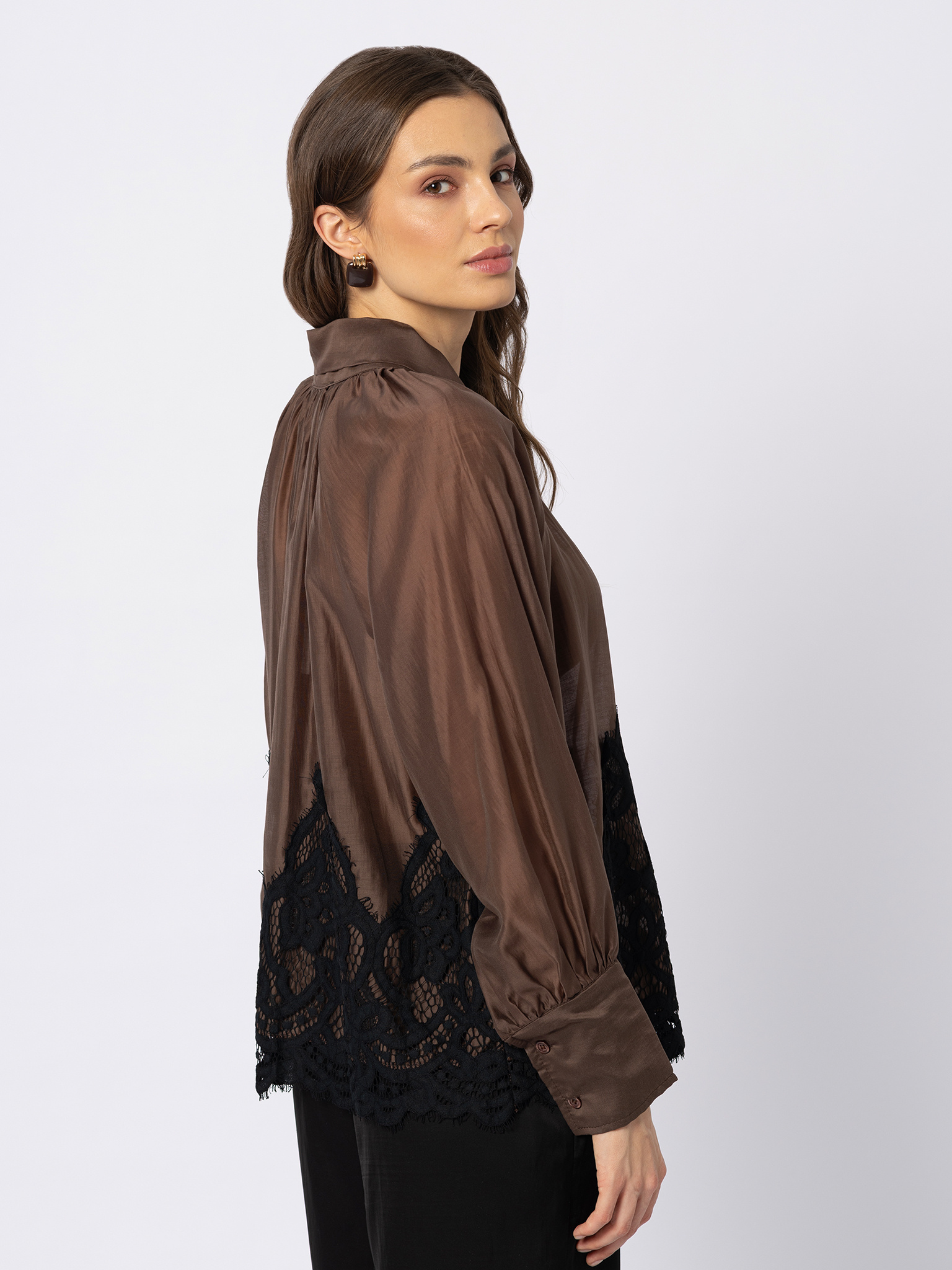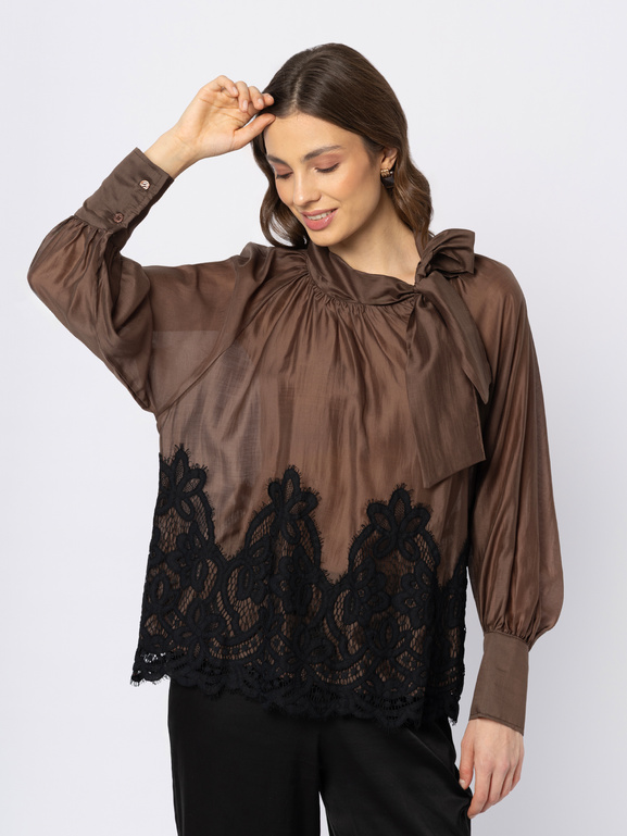 Brązowa bluzka z lyocellu z wiązaniem pod szyją zakończona koronką