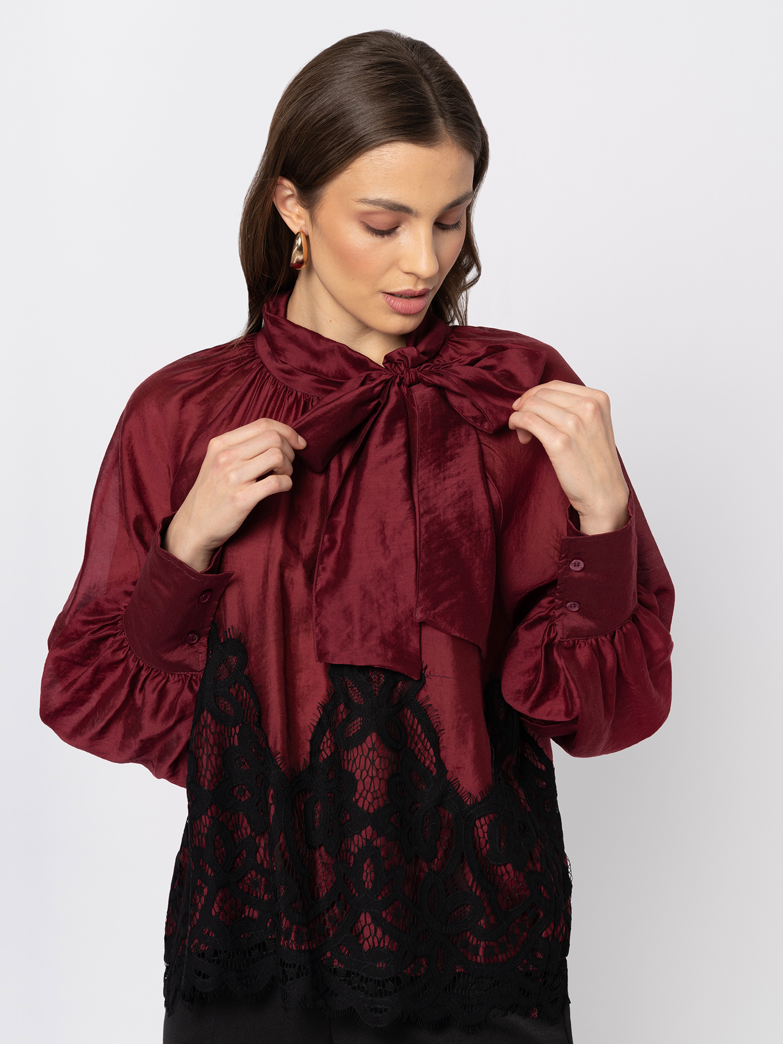Bordowa bluzka z lyocellu z wiązaniem pod szyją zakończona koronką