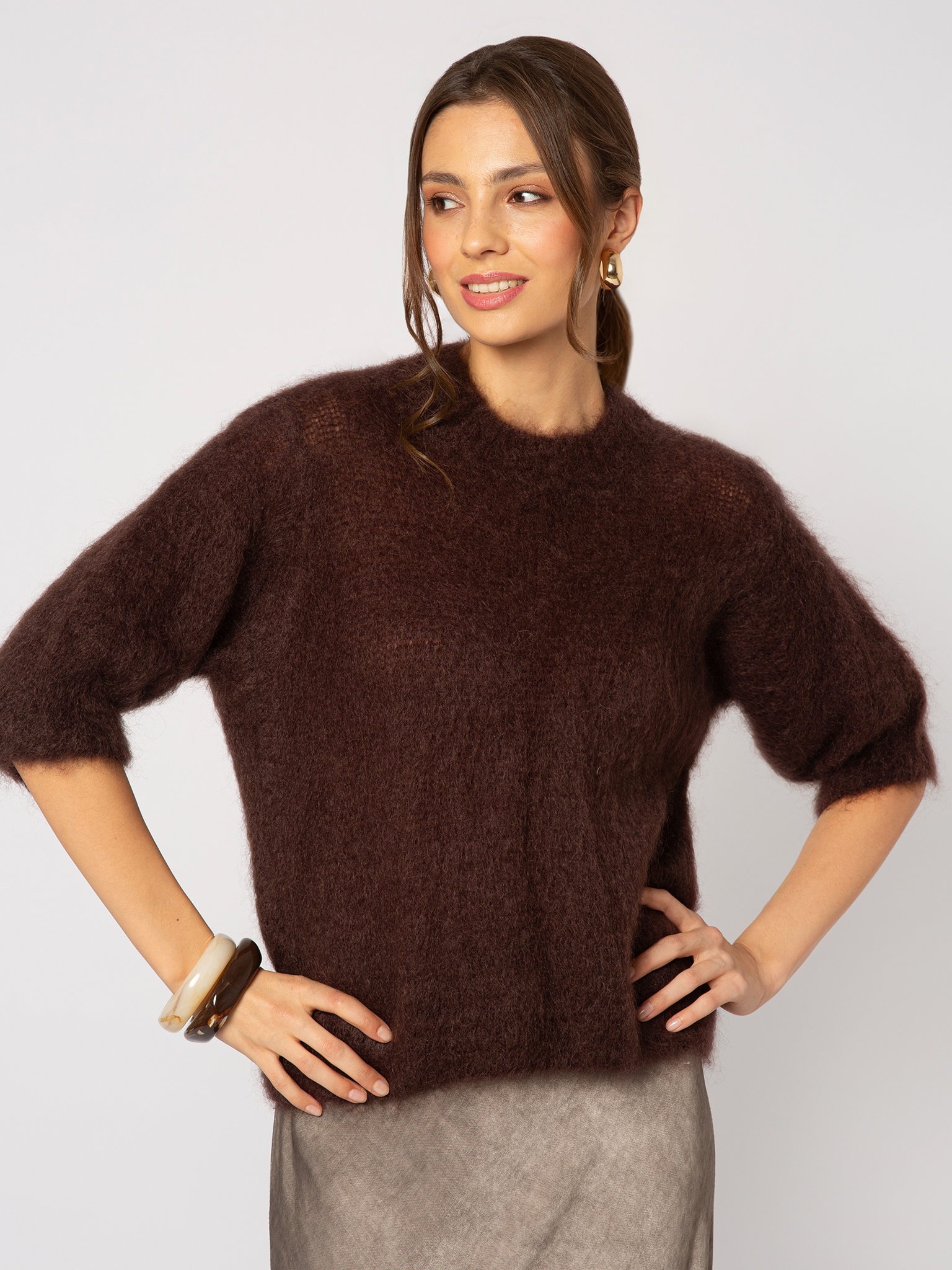 Moherowy brązowy sweter z rękawem 3/4