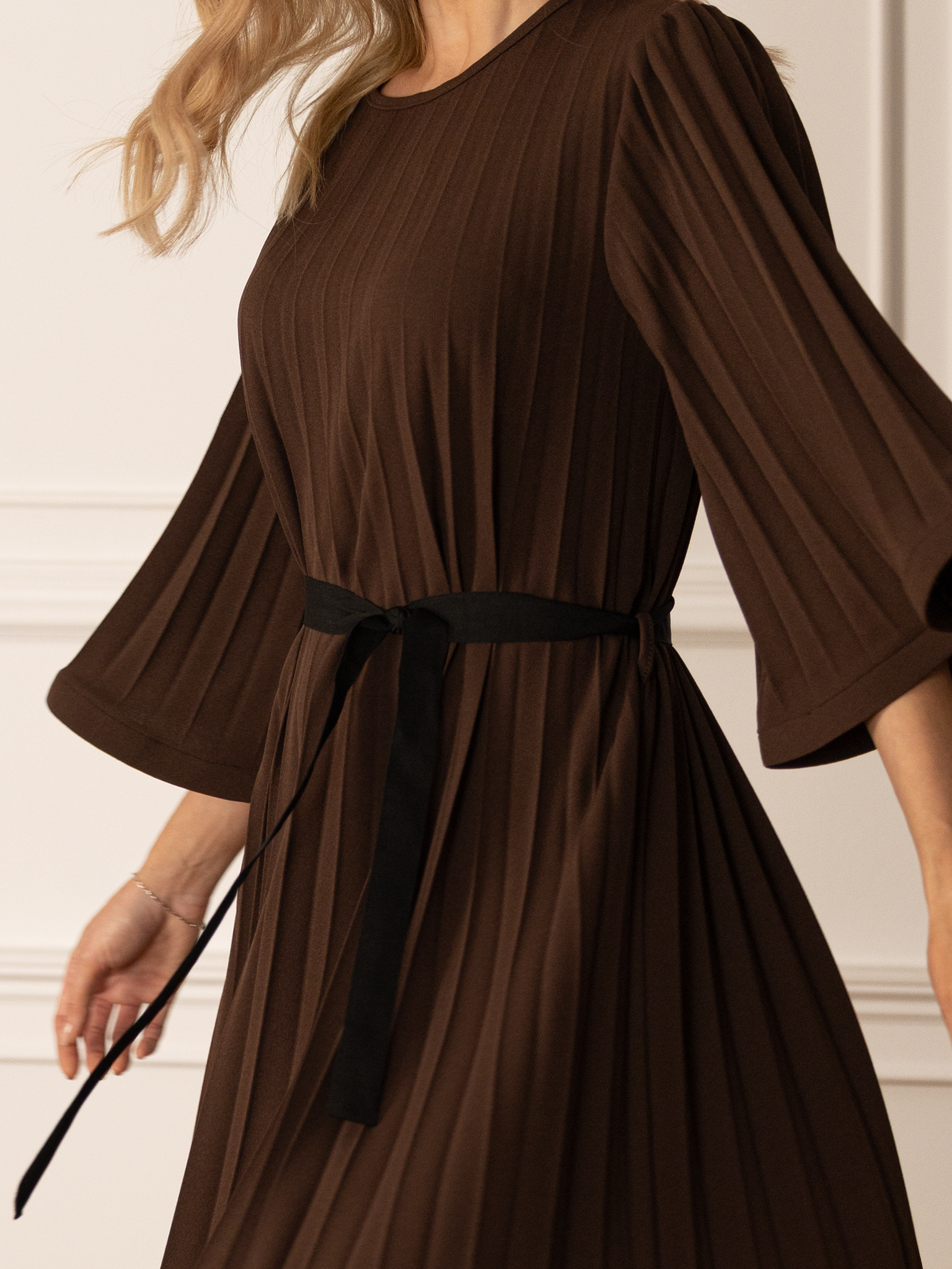 Subtelna, a jednocześnie spektakularna — ta brązowa plisowana sukienka zachwyca swoim kształtem i wyjątkową konstrukcją. Trapezowy krój i okrągły dekolt nadają jej lekkości, a plisowanie na całej długości tworzy efekt miękkiego, luksusowego ruchu.