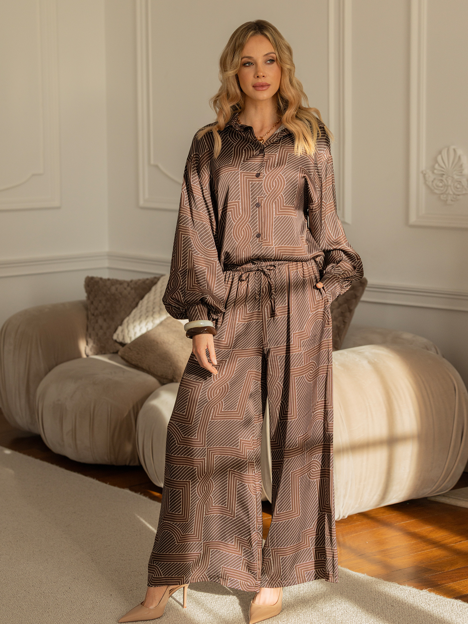 - Nowoczesne, lekkie i niezwykle komfortowe, idealny wybór dla kobiet, które kochają styl bez wysiłku. Szerokie nogawki pięknie układają się w ruchu, tworząc efekt wydłużonej sylwetki. W komplecie z koszulą z tej samej tkaniny tworzą wyjątkowy mono look.