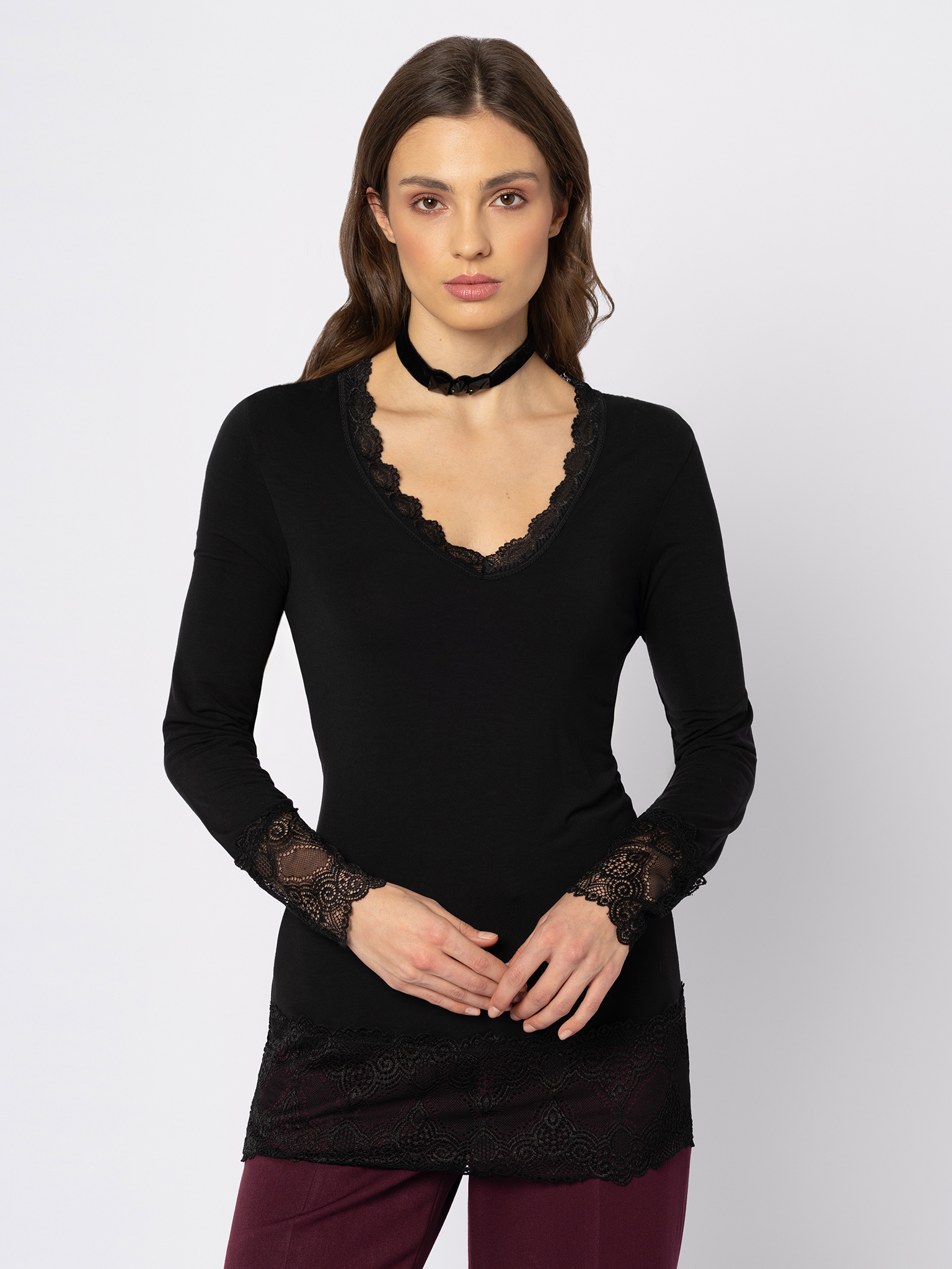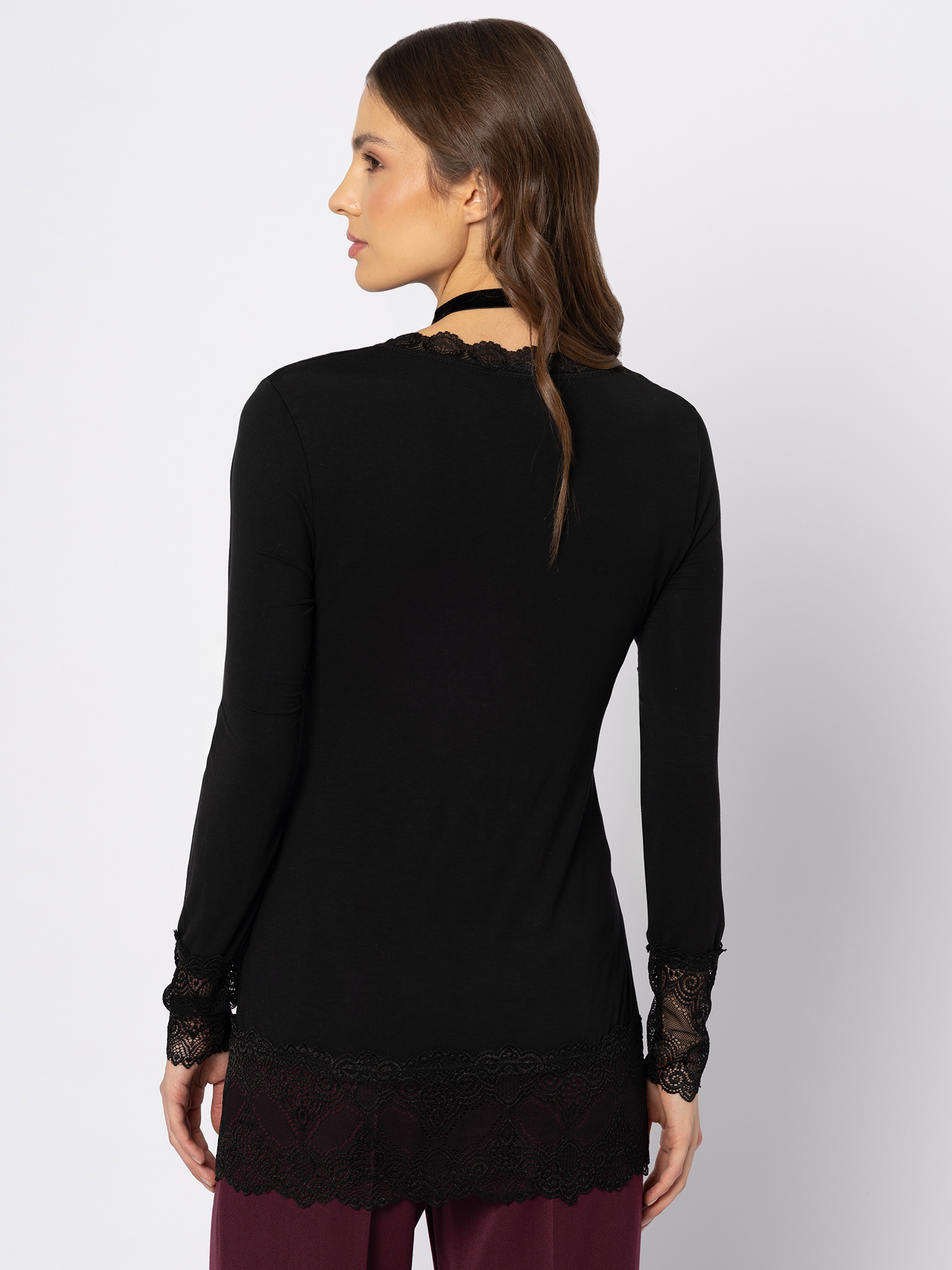 Czarna wiskozowa bluzka w serek wykończona koronką