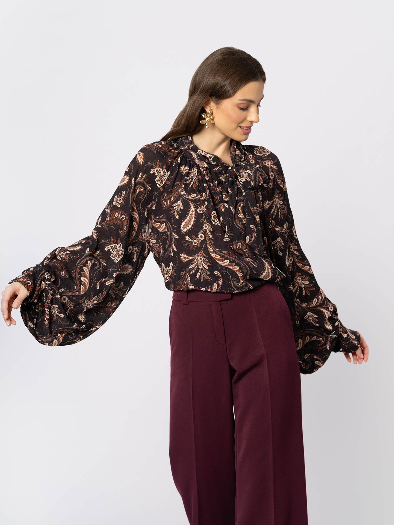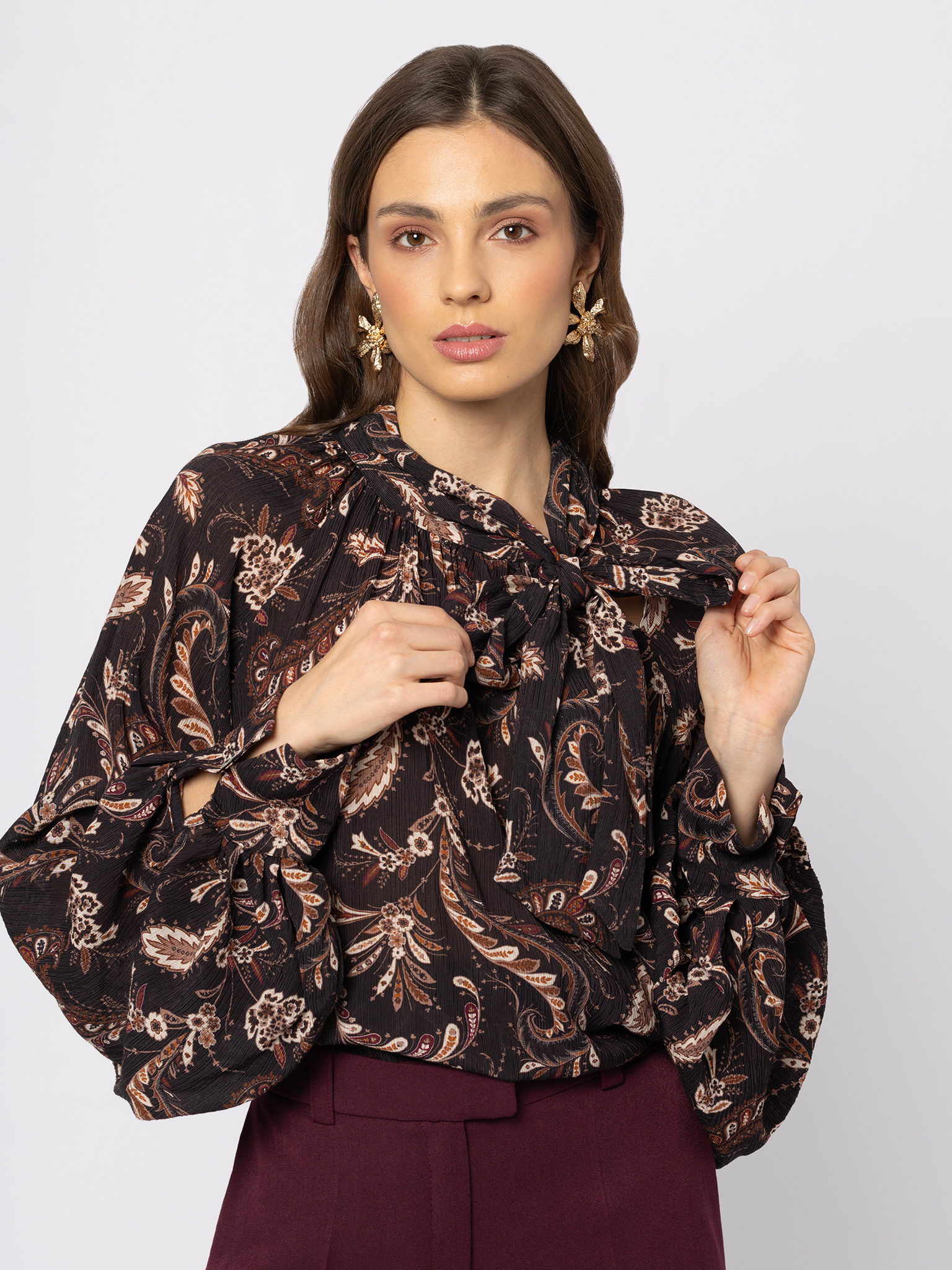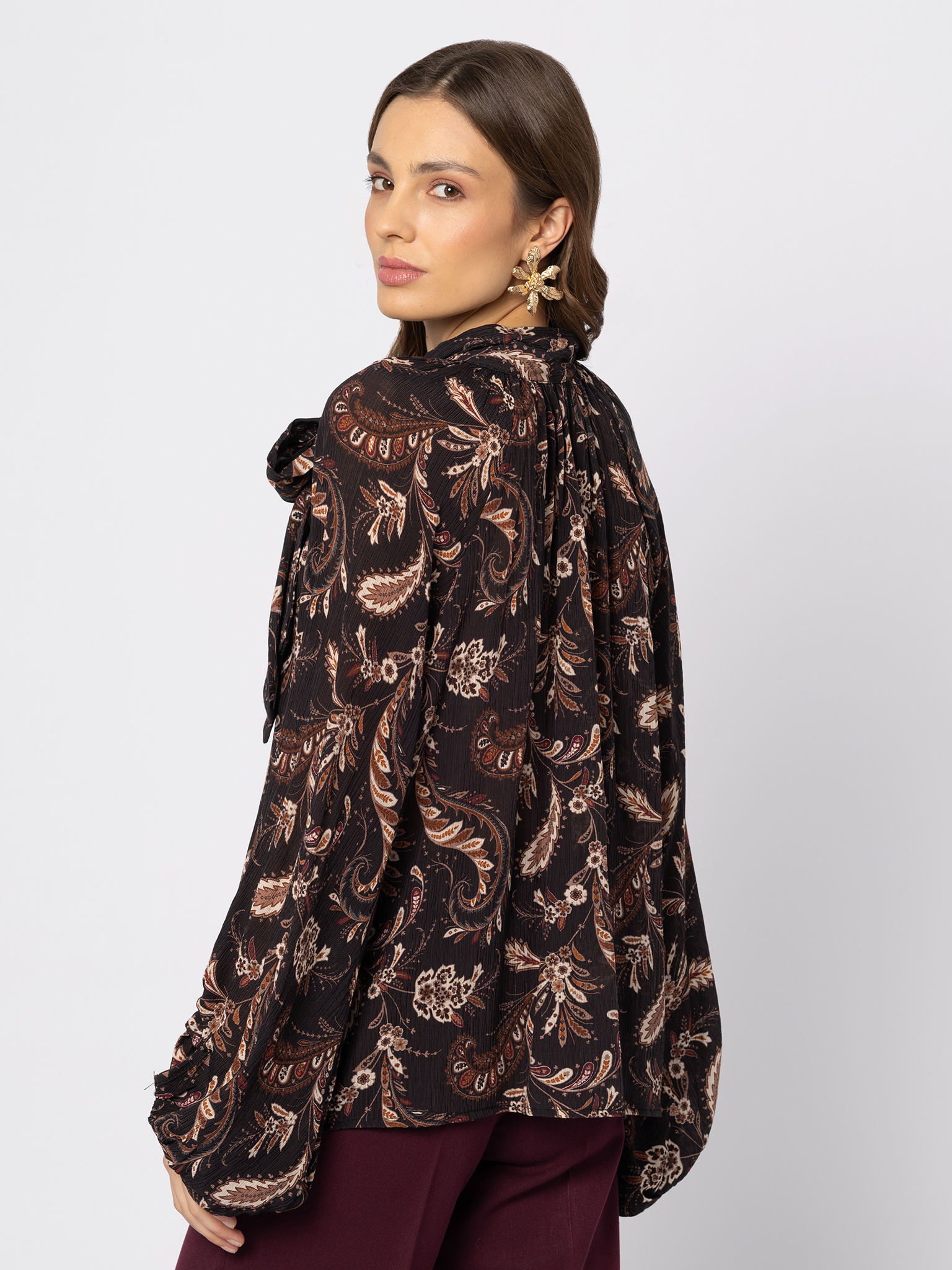 Czarna wzorzysta bluzka z lyocellu z wiązaniem pod szyją