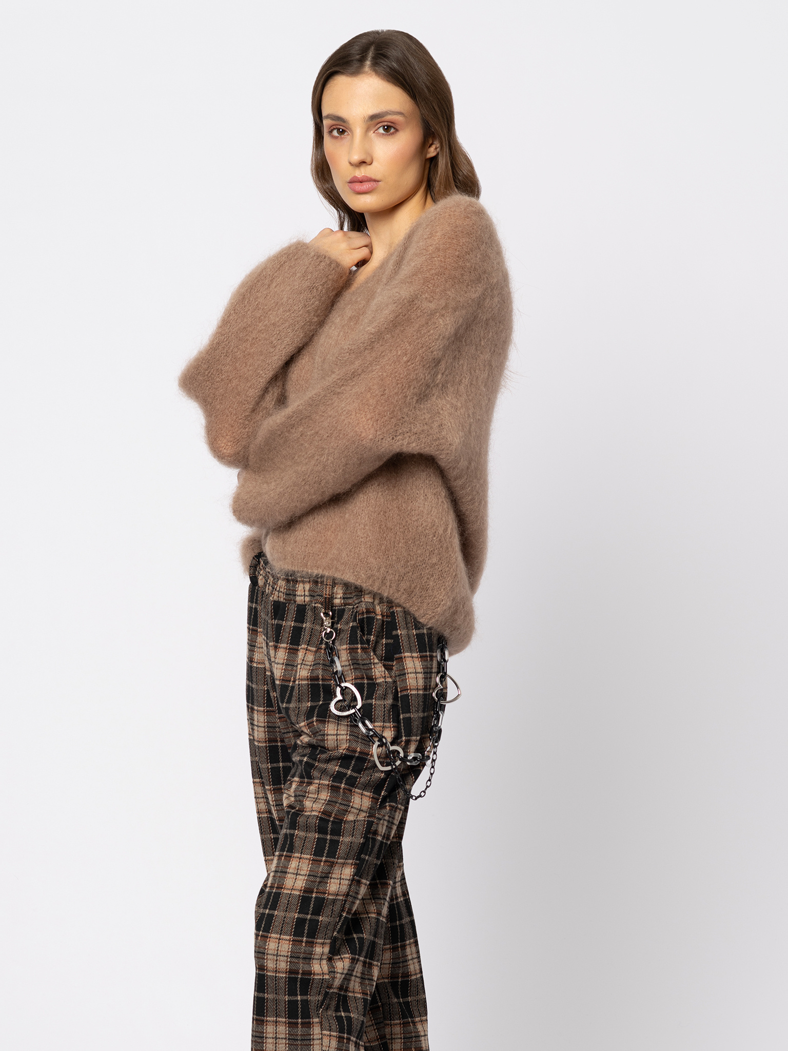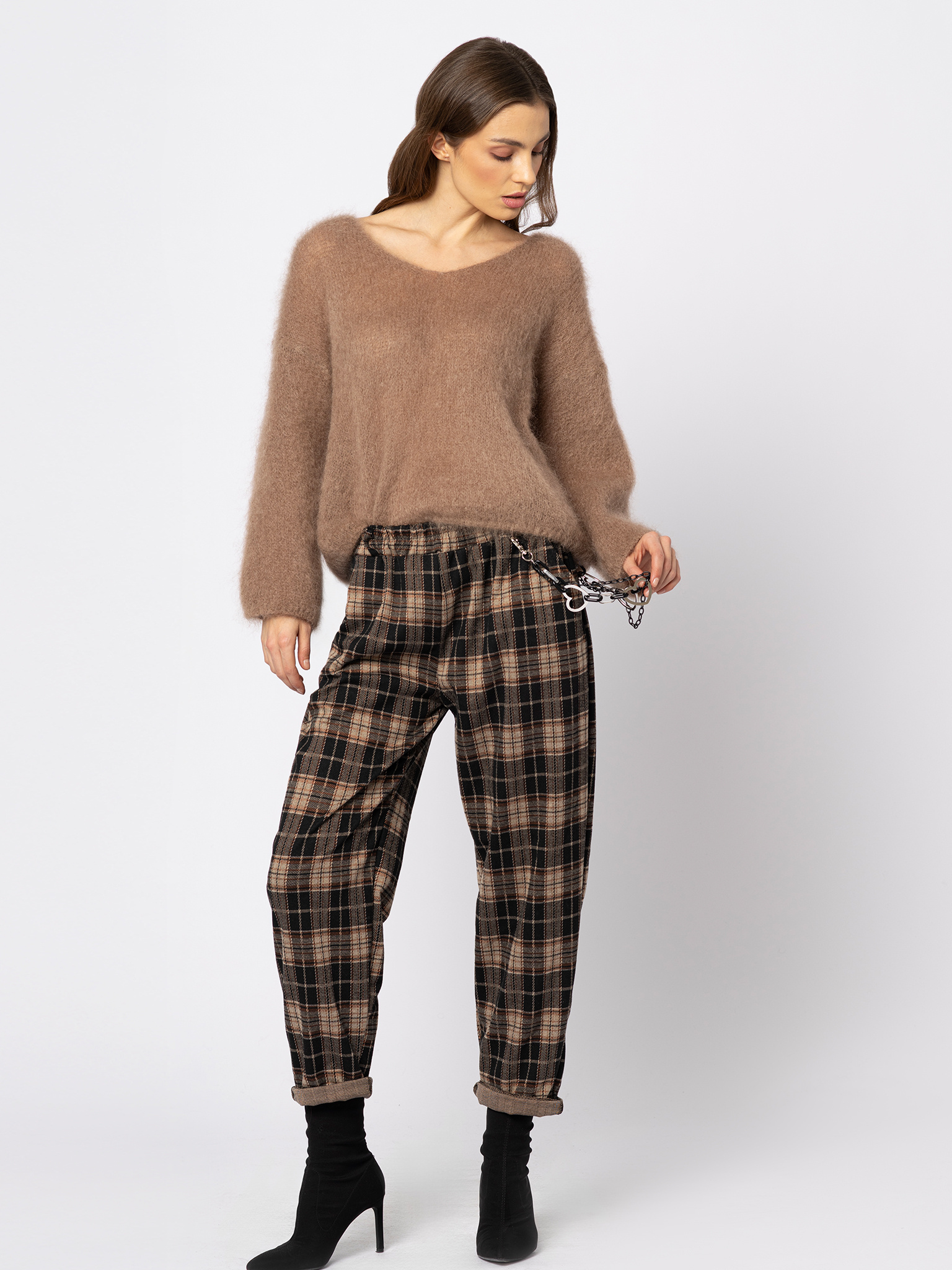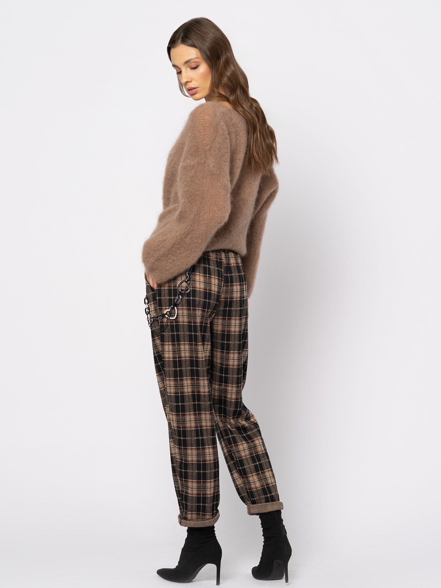Czarne spodnie w beżową kratę z odpinanym łańcuchem