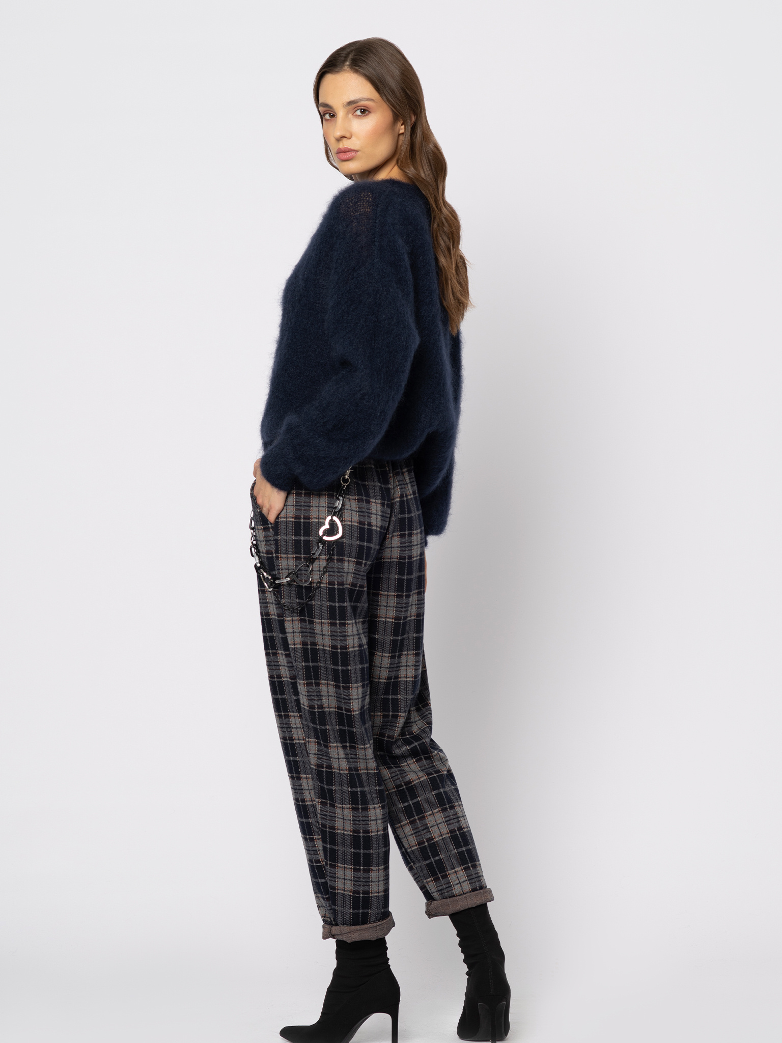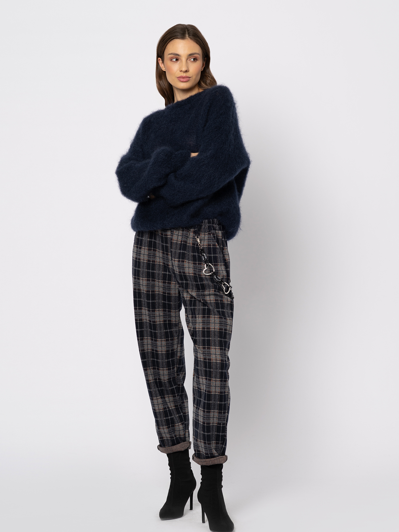 Granatowe spodnie w niebieską kratę z odpinanym łańcuchem