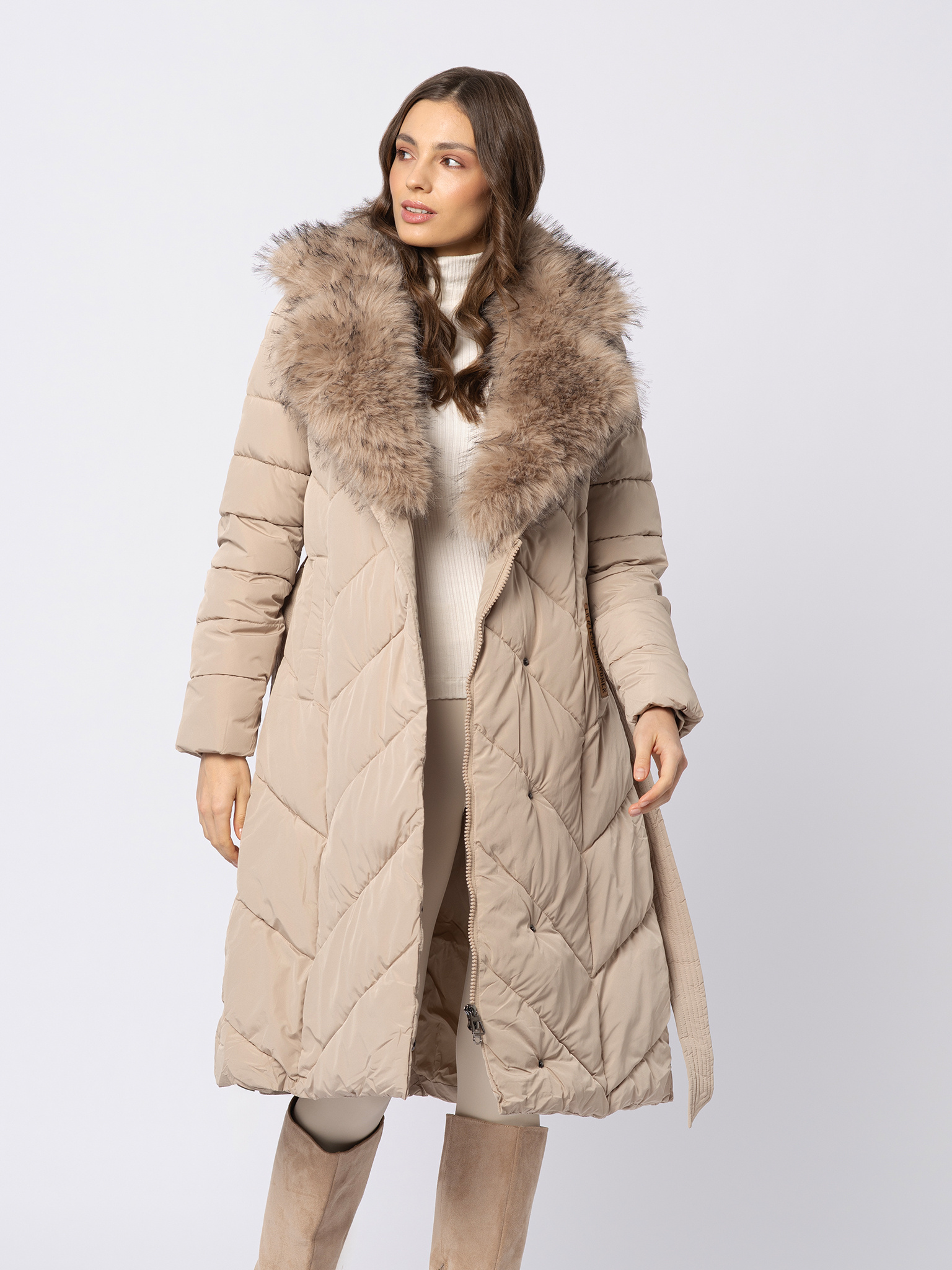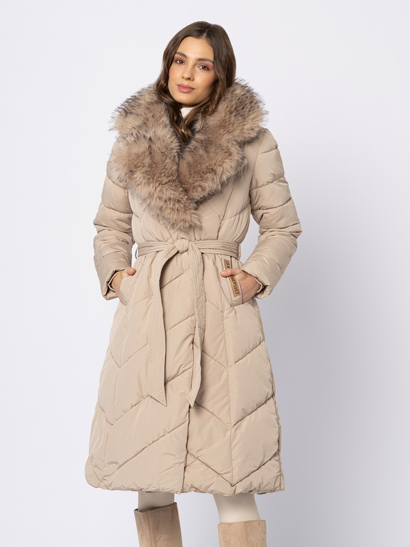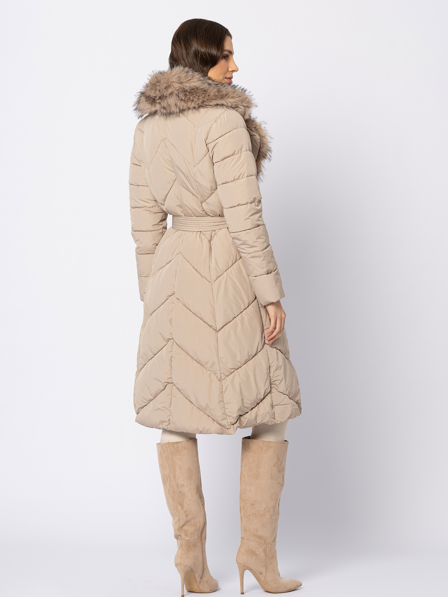 Stylowy, ciepły i wyjątkowo efektowny — ten beżowy płaszcz to zimowy must-have, który łączy wygodę puchowego okrycia z elegancją. Duże pikowanie w jodełkę nadaje mu luksusowy, nowoczesny charakter, a odpinany kołnierz z imitacji futra pozwala tworzyć dwa różne looki: od codziennej klasyki po bardziej glamour.