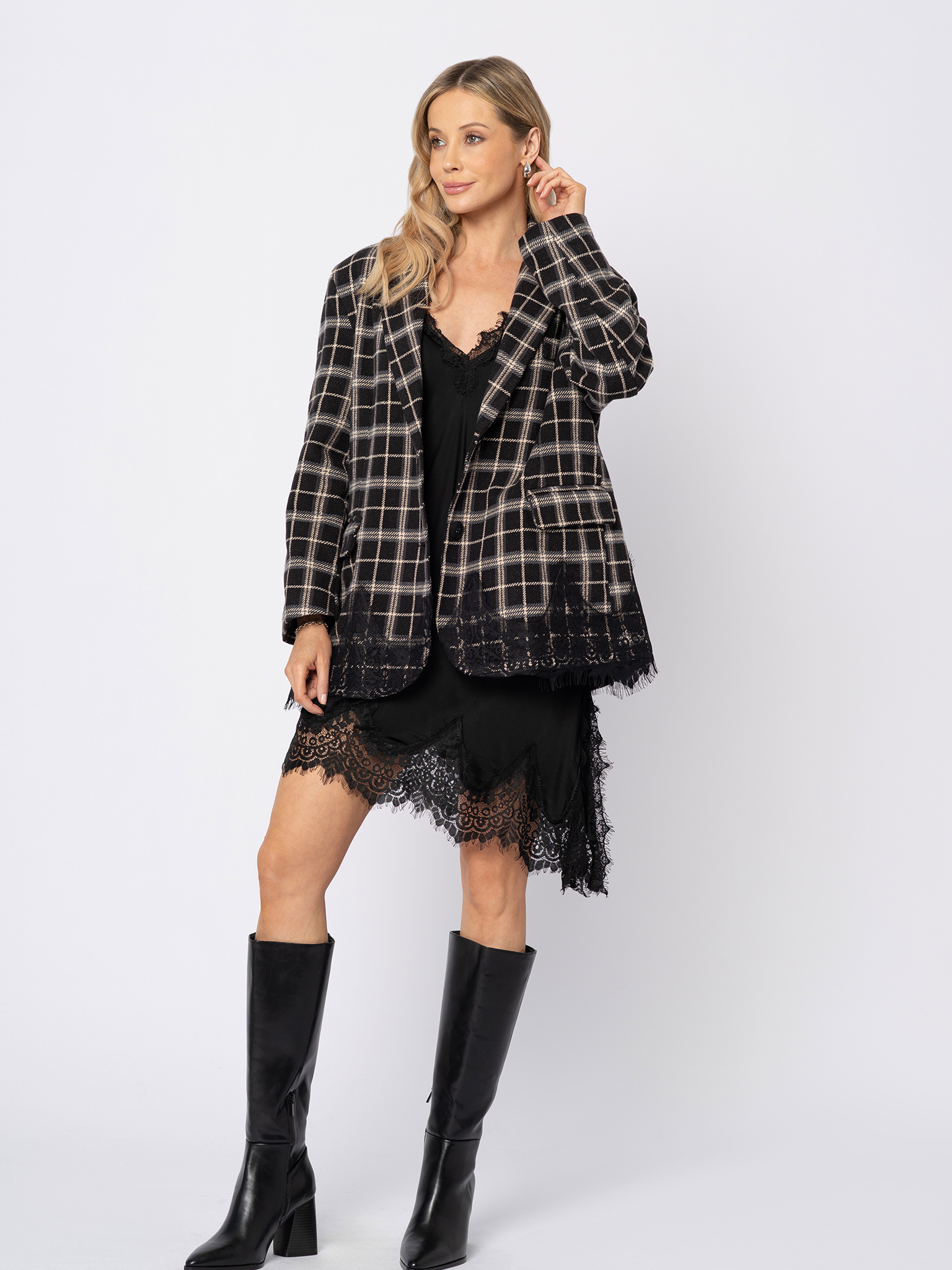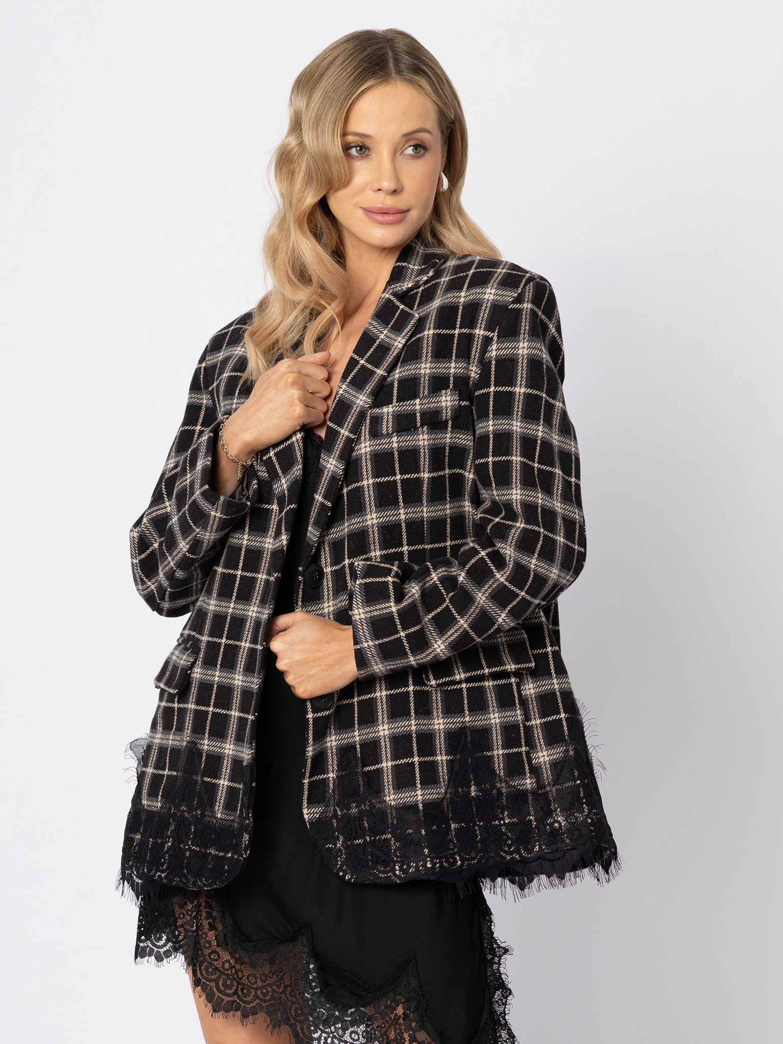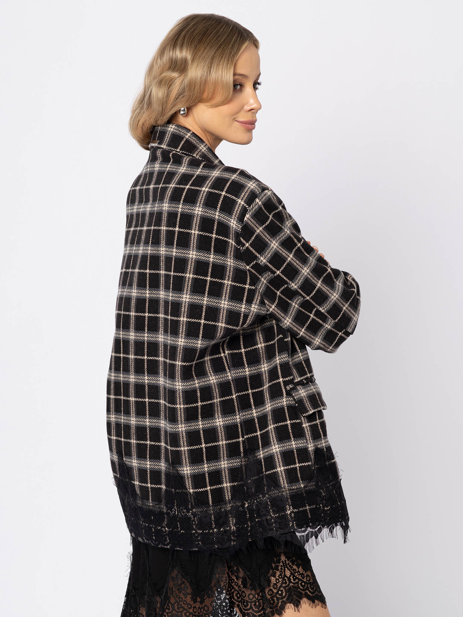 Oversizowa marynarka w kratę wykończona koronką