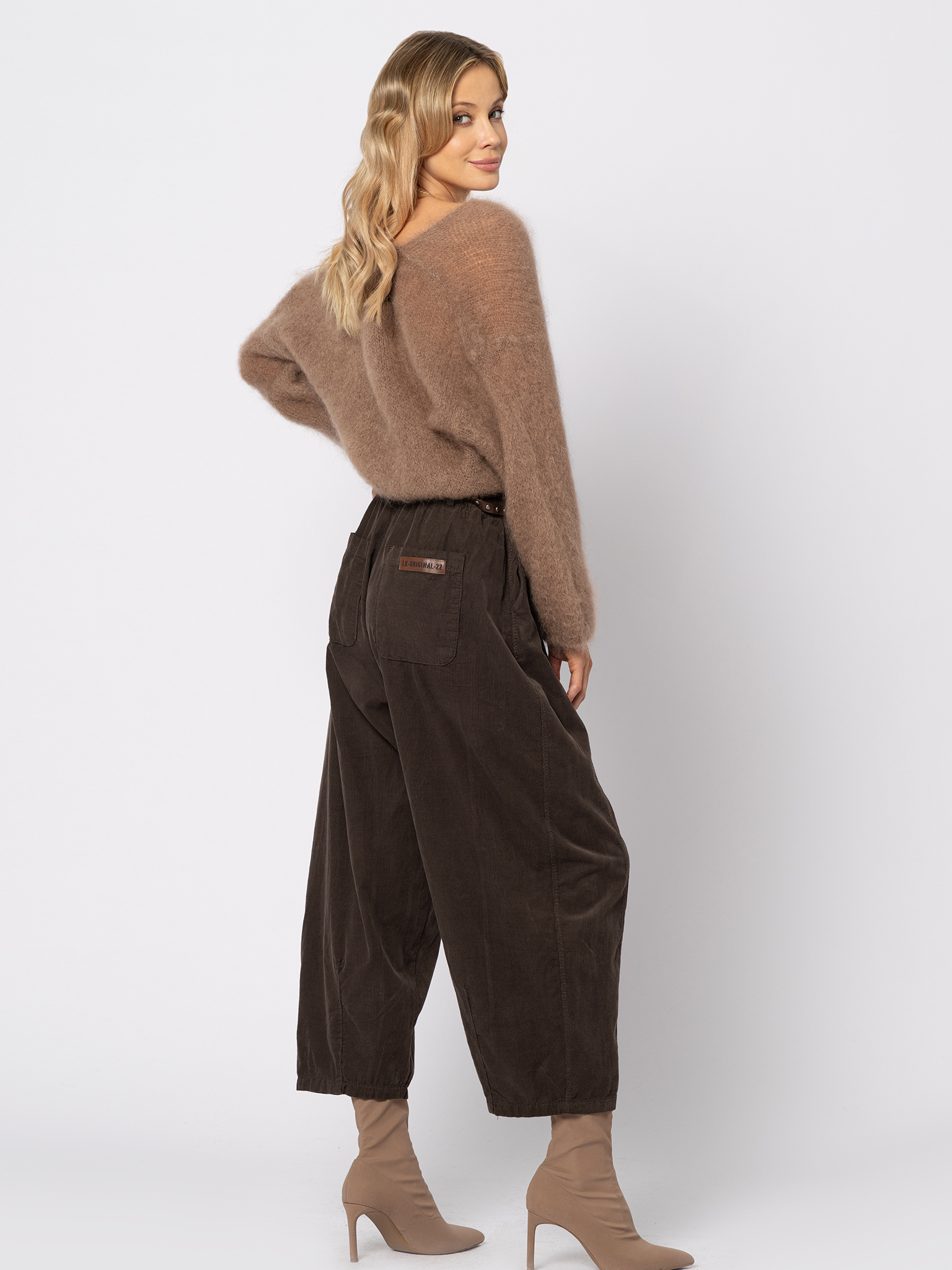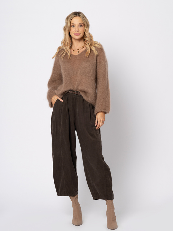 Sztruksowe brązowe spodnie typu balloon z paskiem