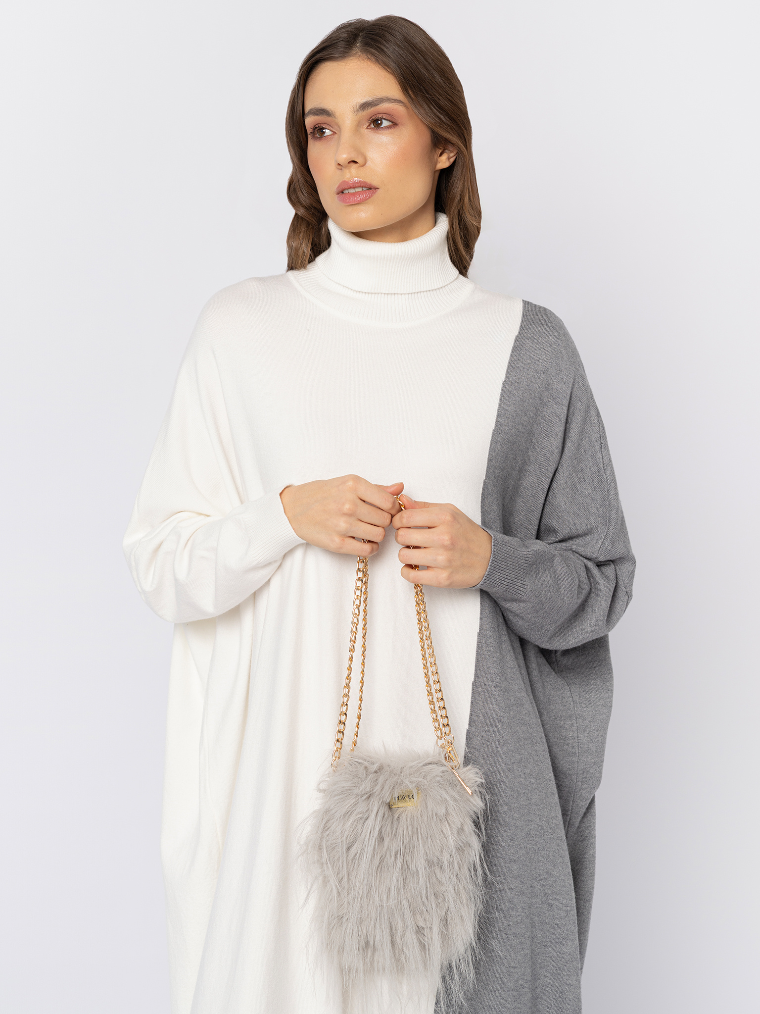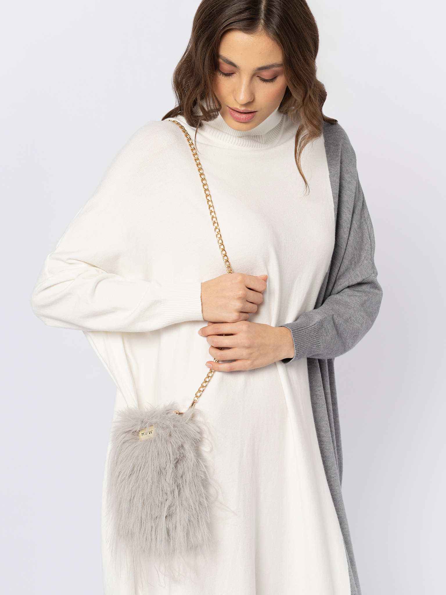 Mała jasno szara torebka z eco fytra z długim włosem