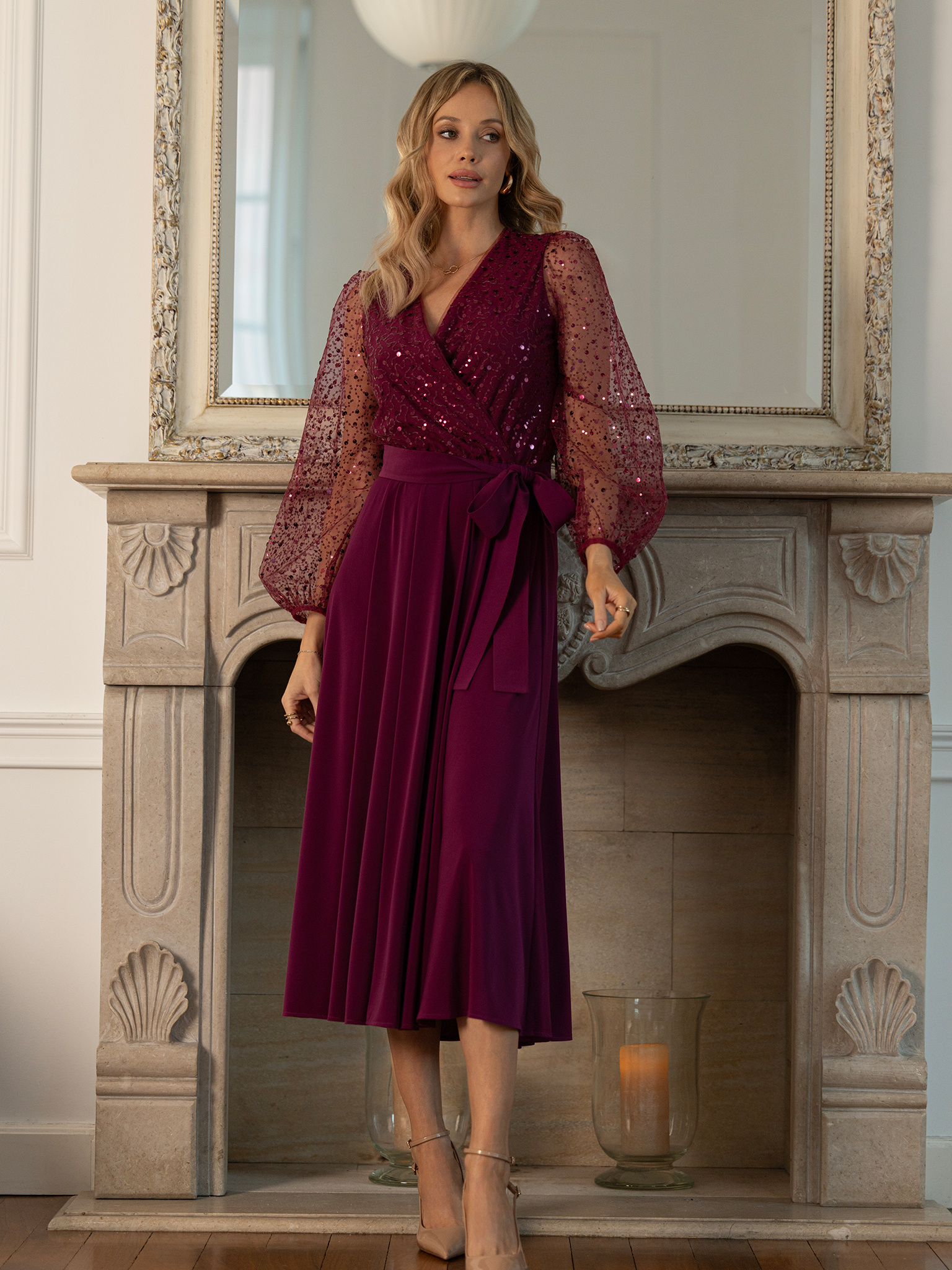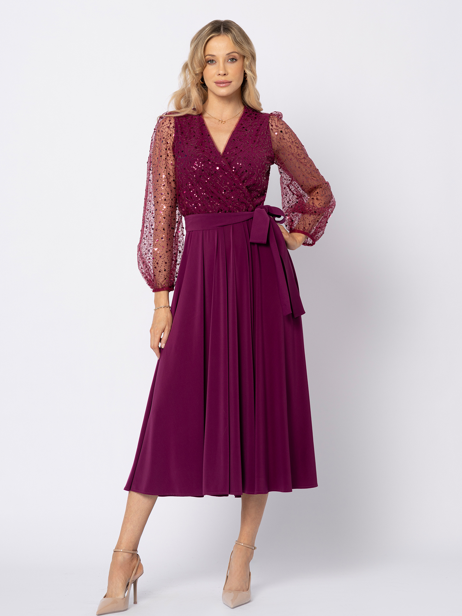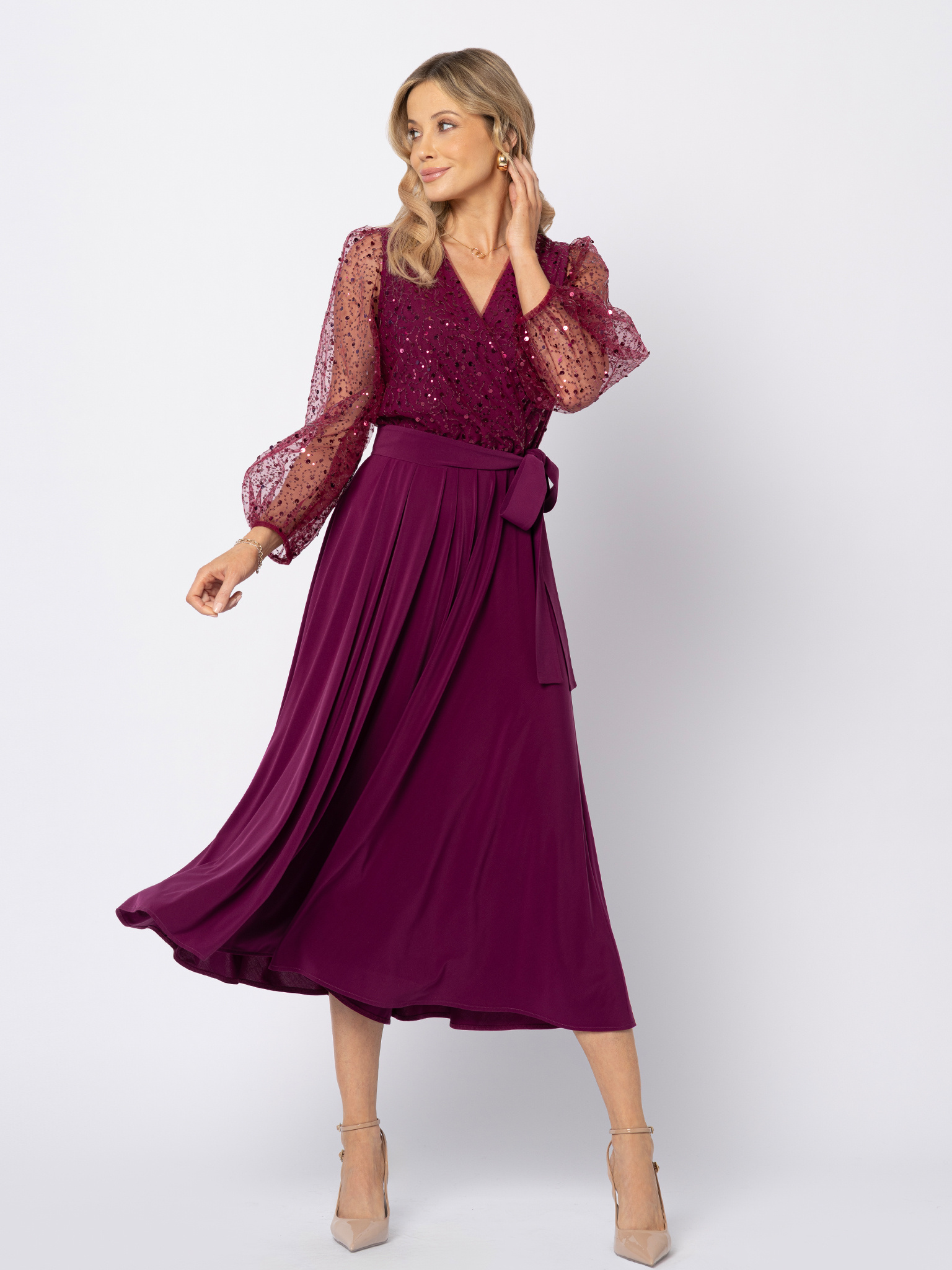Góra sukienki wykonana jest z delikatnej burgundowej tkaniny z mieniącymi się cekinami, które subtelnie iskrzą przy każdym ruchu, tworząc efekt glamour. Kopertowy dekolt podkreśla szyję i linię biustu, a długie bufiaste rękawy wprowadzają nutę romantycznej zmysłowości.
