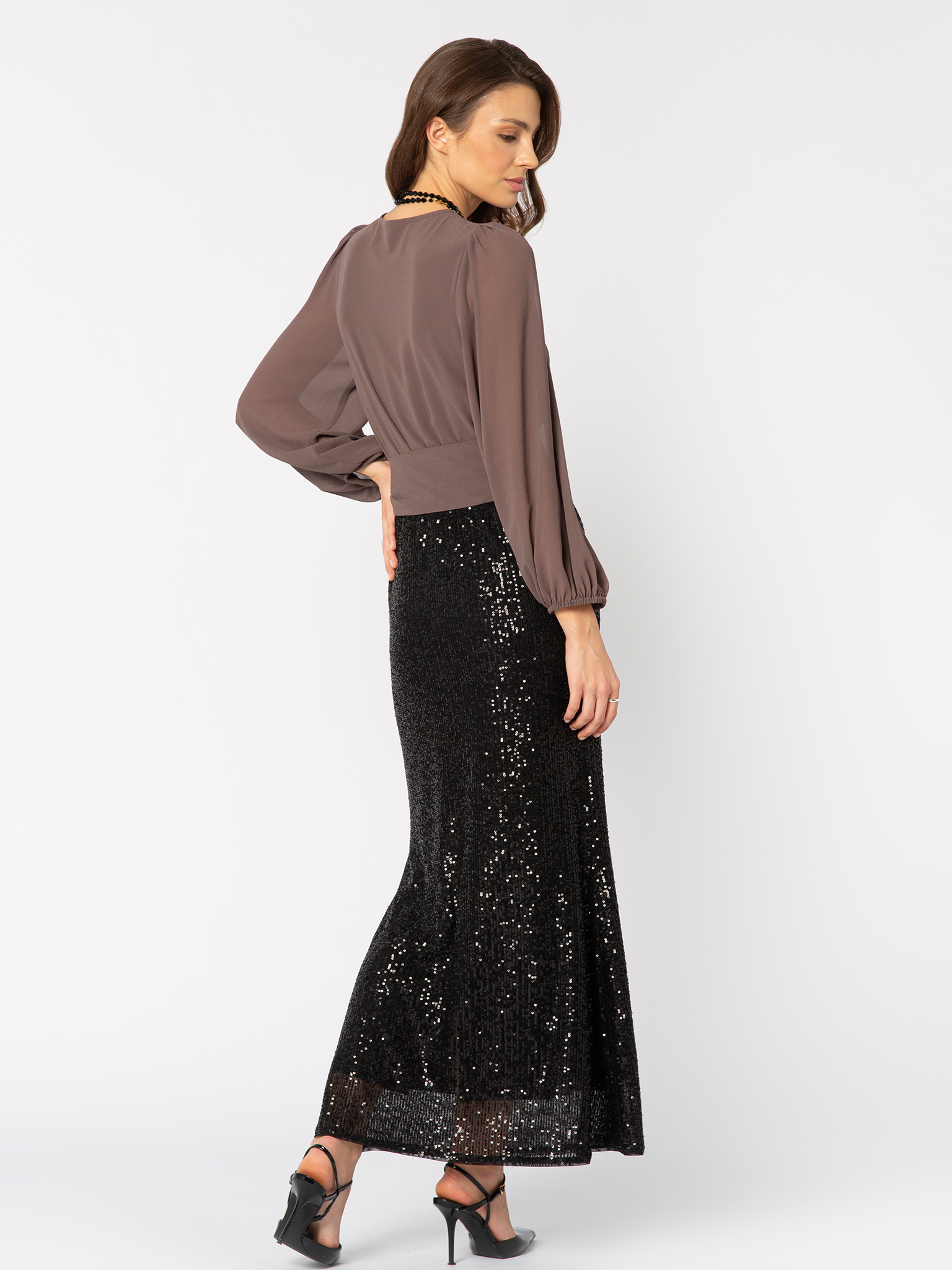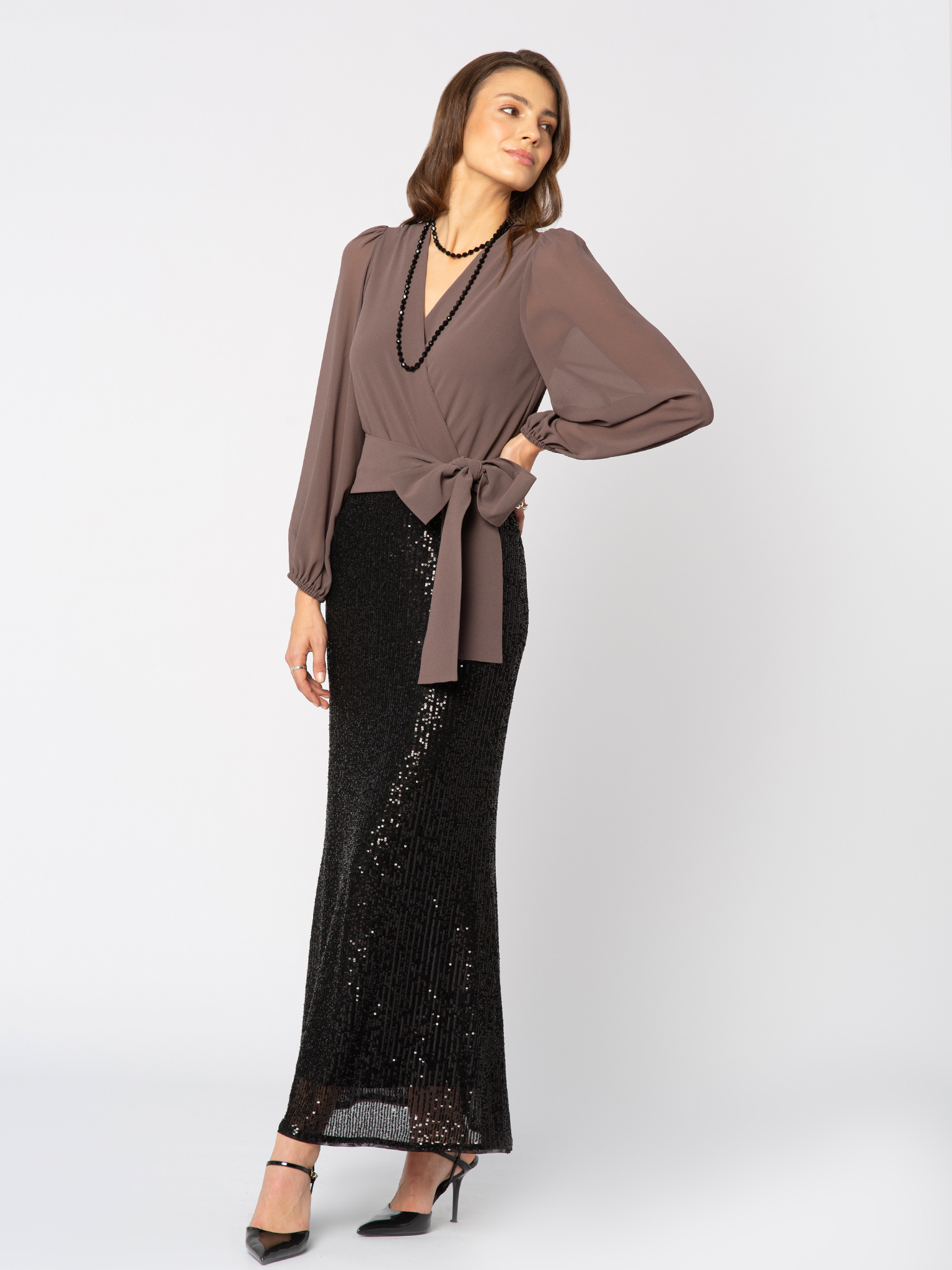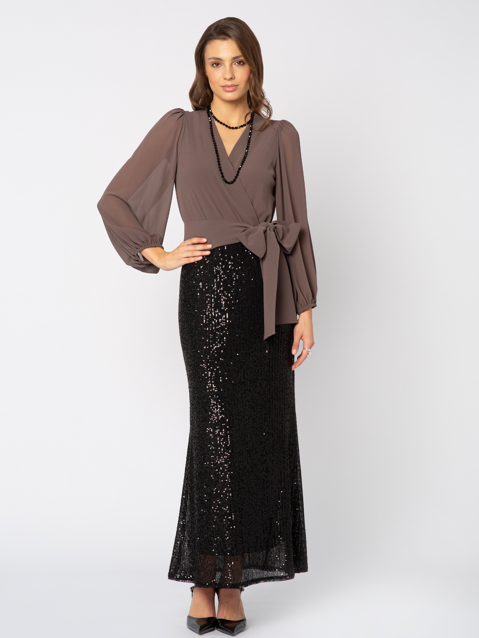 Góra sukienki została wykonana z delikatnego, lejącego szyfonu w odcieniu fango — subtelnego, wyrafinowanego koloru, który pięknie komponuje się z odcieniem skóry. Kopertowy dekolt dodaje zmysłowości i optycznie wysmukla sylwetkę, a długie, bufiaste rękawy wprowadzają lekkość i nowoczesny charakter z nutą glamour.