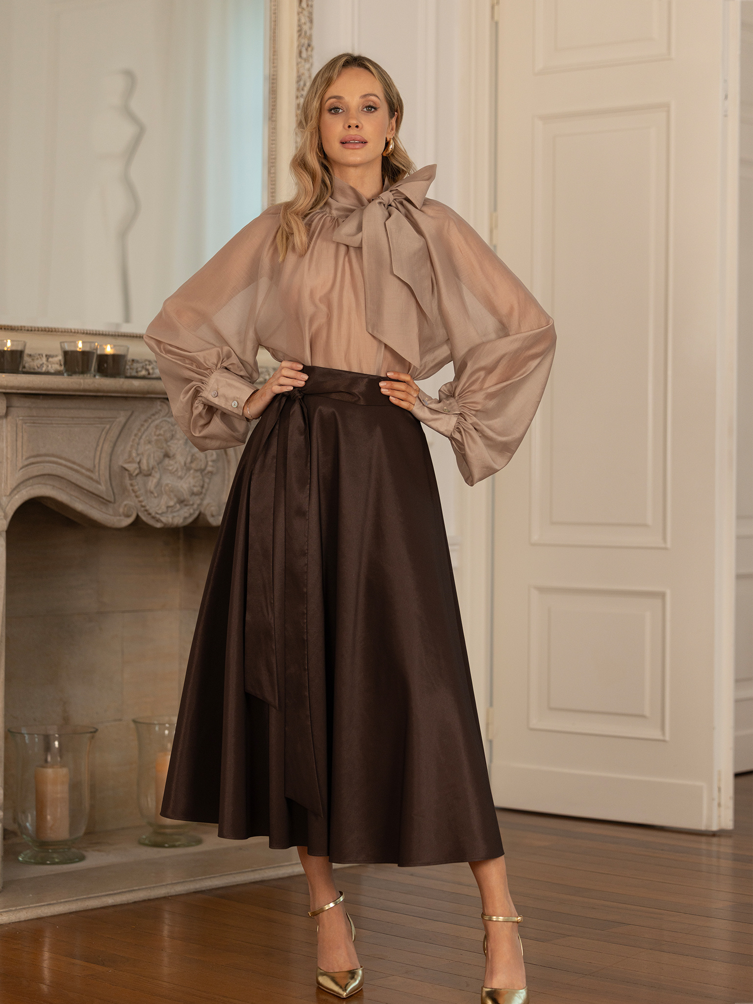 Wiązanie przy szyi przyciąga spojrzenia. Możesz je zawiązać w elegancką kokardę lub subtelny węzeł. To detal, który nadaje stylizacji wyjątkowej lekkości i francuskiego szyku.