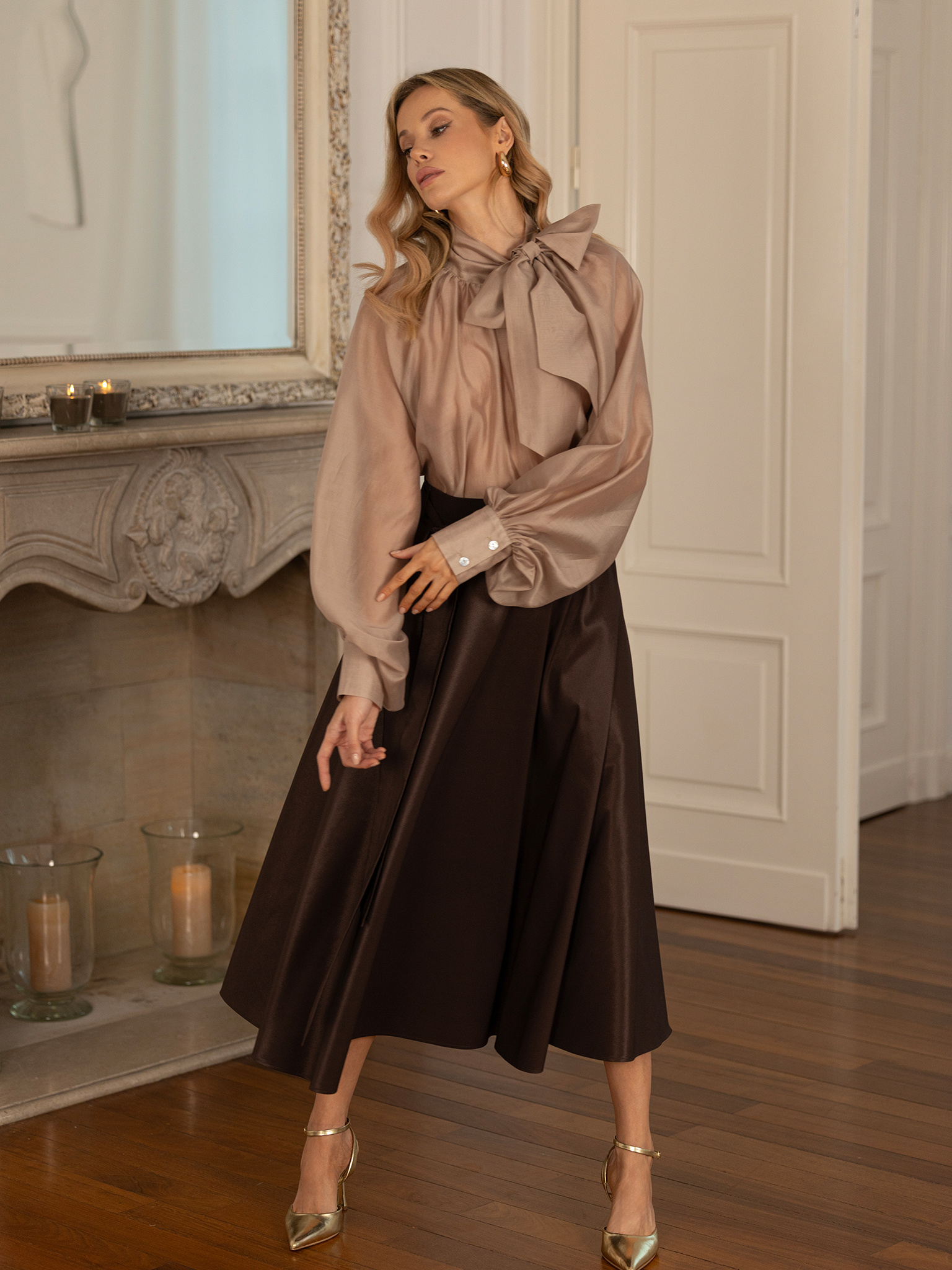 Beżowa bluzka z tencelu z wiązaniem przy szyi Toulouse