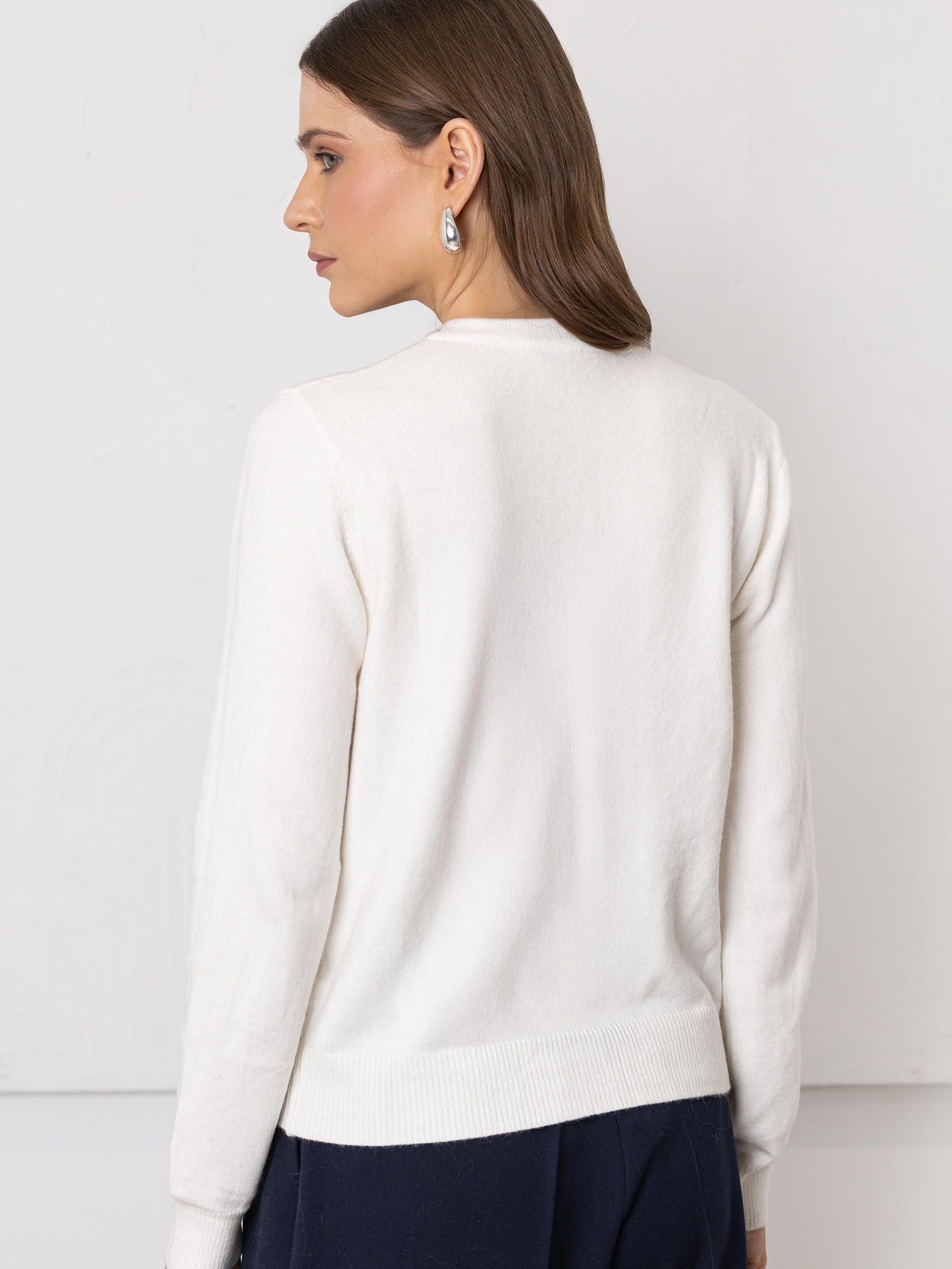 Kardigan damski w kolorze ecru świetnie komponuje się ze spodniami z wysokim stanem lub tiulową spódnicą.