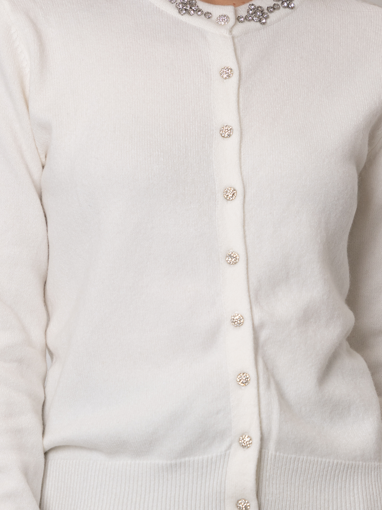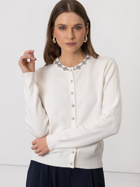 Okrągły dekolt ozdobiony kryształkami przyciąga uwagę i nadaje kardiganowi wyjątkowego, biżuteryjnego charakteru. Ozdobne guziki stanowią eleganckie wykończenie całości, dzięki czemu model doskonale sprawdzi się zarówno w stylizacjach dziennych, jak i bardziej wieczorowych.