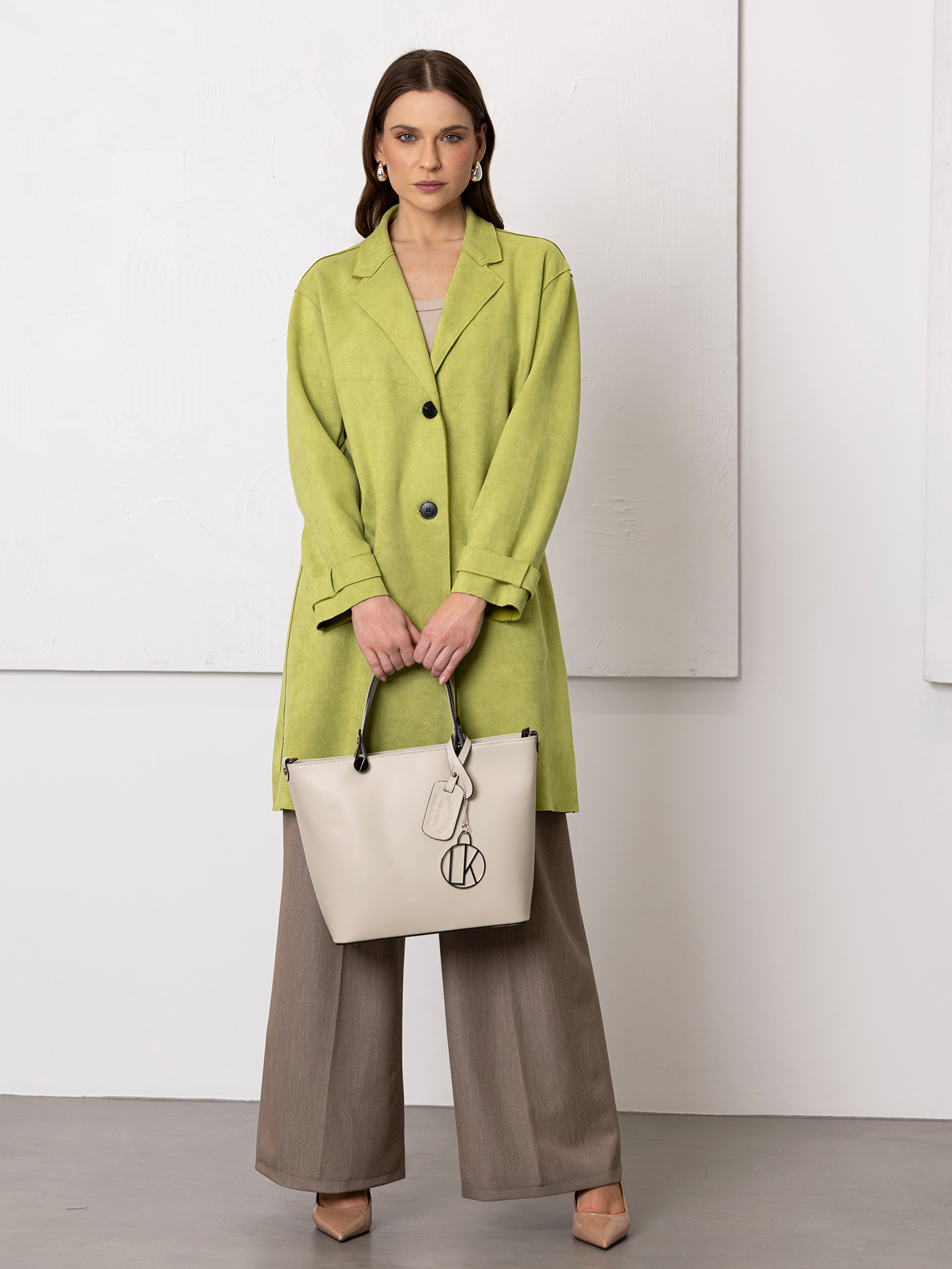 Wyrazisty, świeży i niezwykle nowoczesny — ten limonkowy płaszcz damski to mocny akcent w minimalistycznej formie. Prosty krój, klasyczne klapy i zapięcie na dwa guziki tworzą surową, czystą sylwetkę, która pozwala kolorowi grać główną rolę.
