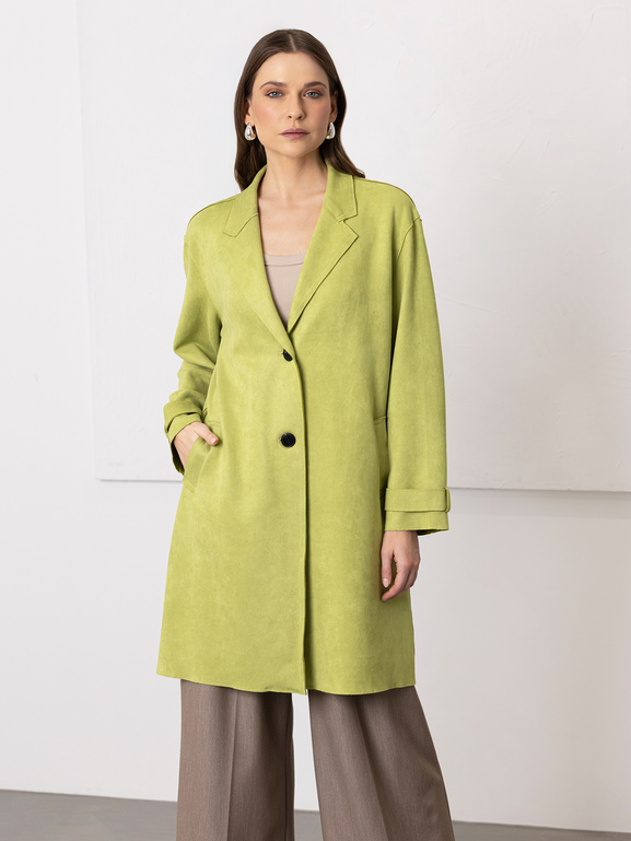 Brak podszewki sprawia, że płaszcz jest lekki i idealny na wiosnę, a limonkowy odcień ożywia stylizacje i dodaje im modowego charakteru. To propozycja dla kobiet, które lubią prostotę przełamaną kolorem i chcą wyróżnić się w subtelny sposób.