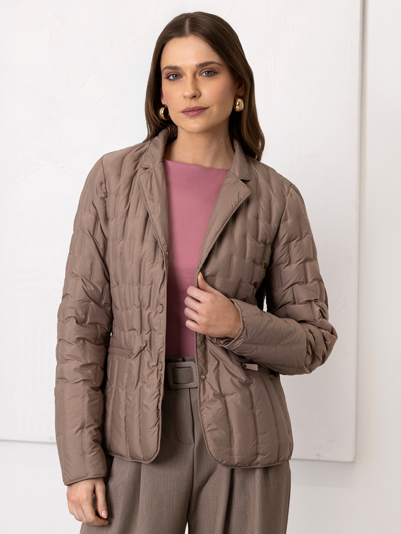 Minimalizm w nowoczesnym wydaniu. Lekka pikowana kurtka puchowa damska o dopasowanym fasonie typu żakiet łączy elegancję z funkcjonalnością. Minimalistyczny kołnierz przy szyi i delikatne prostokątne, asymetryczne pikowania tworzą subtelny, uporządkowany efekt, który nadaje całości wyrafinowanego charakteru.