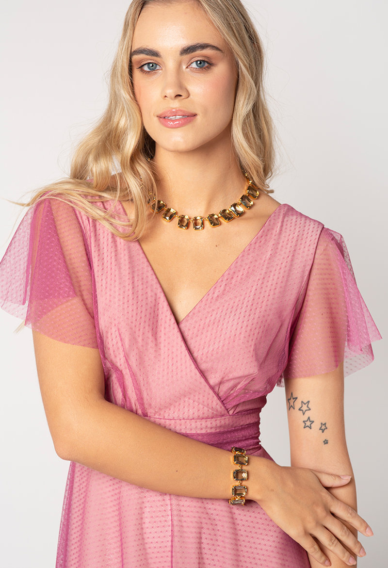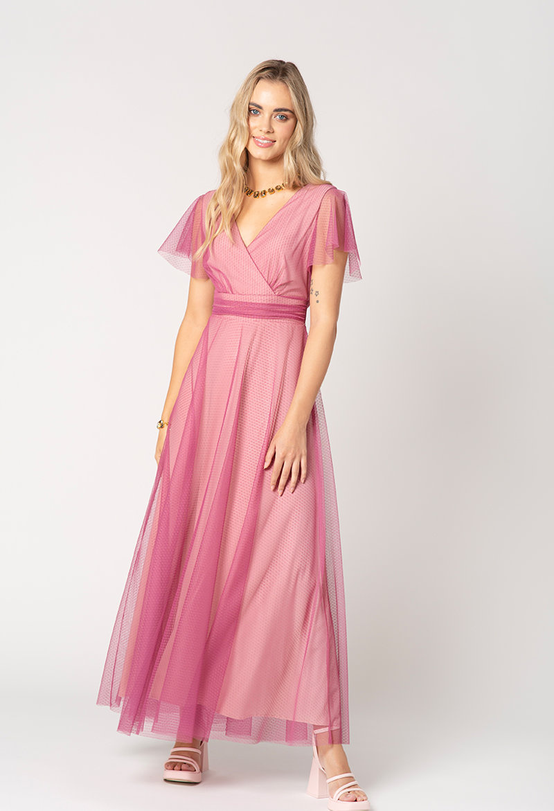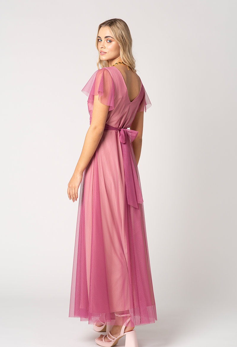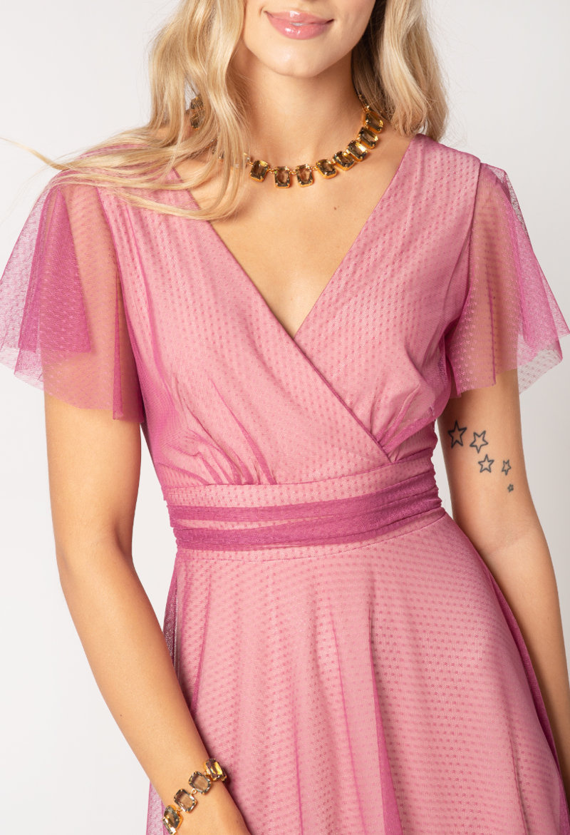 Sukienka Girona w odcieniu wrzosowego różu to propozycja wprost idealna na formalne okazje, takie jak wesele, chrzciny, komunie i inne wyjątkowe uroczystości. Wykonana jest z delikatnego, kropkowanego tiulu. Pod spodem rozjaśnia ją ballado różowa, nieco połyskująca podszewka, wykonana z miękkiej, perfekcyjnie dopasowującej się dzianiny. 100% komfortu gwarantowane. Z tyłu wiązana jest na romantyczną kokardę, idealnie dopasowując w ten sposób sukienkę w talii. Kopertowy dekolt, przepięknie wydłuża szyję i podkreśla kobiecość. W połączeniu z butami na obcasie i biżuterią zachwyci swą wysublimowaną eterycznością.