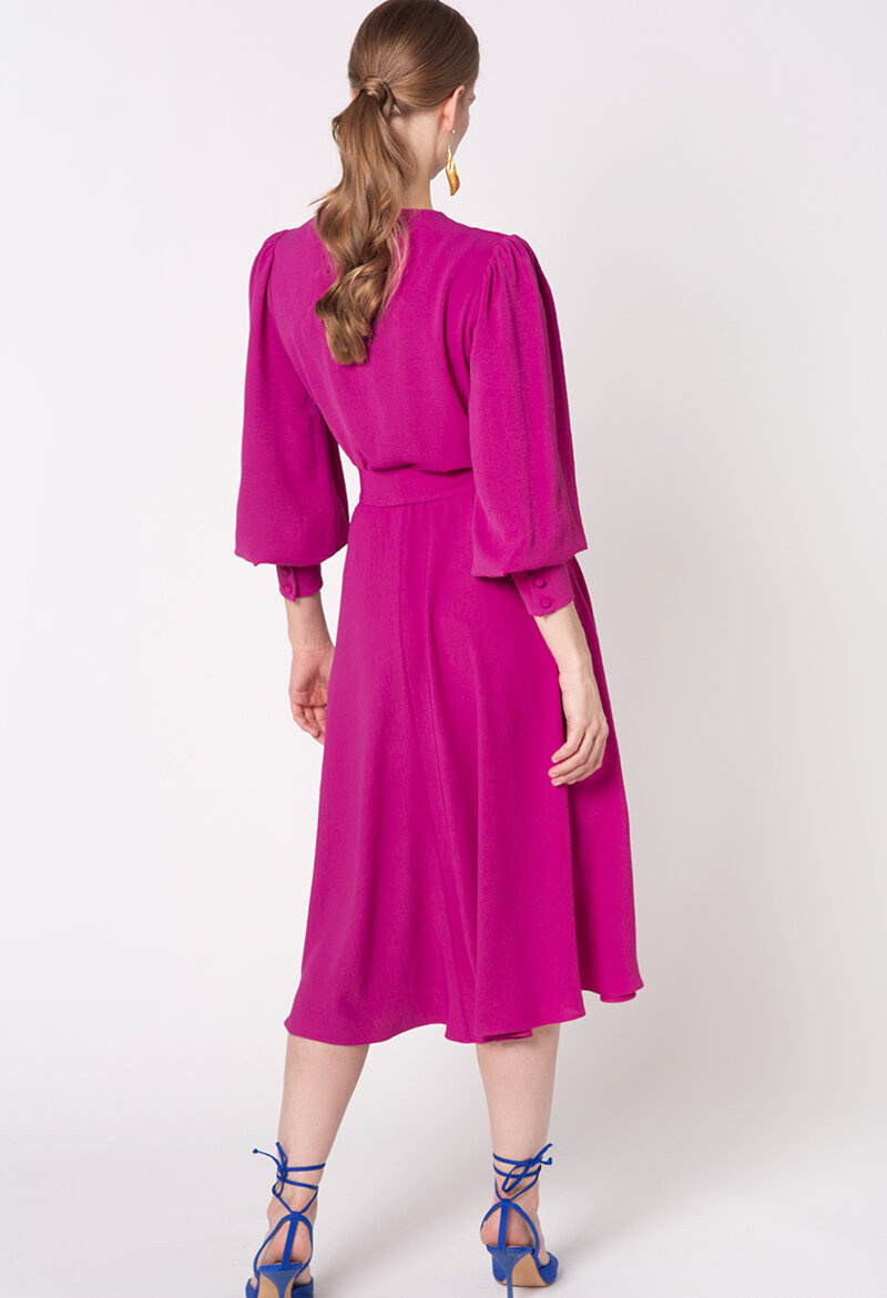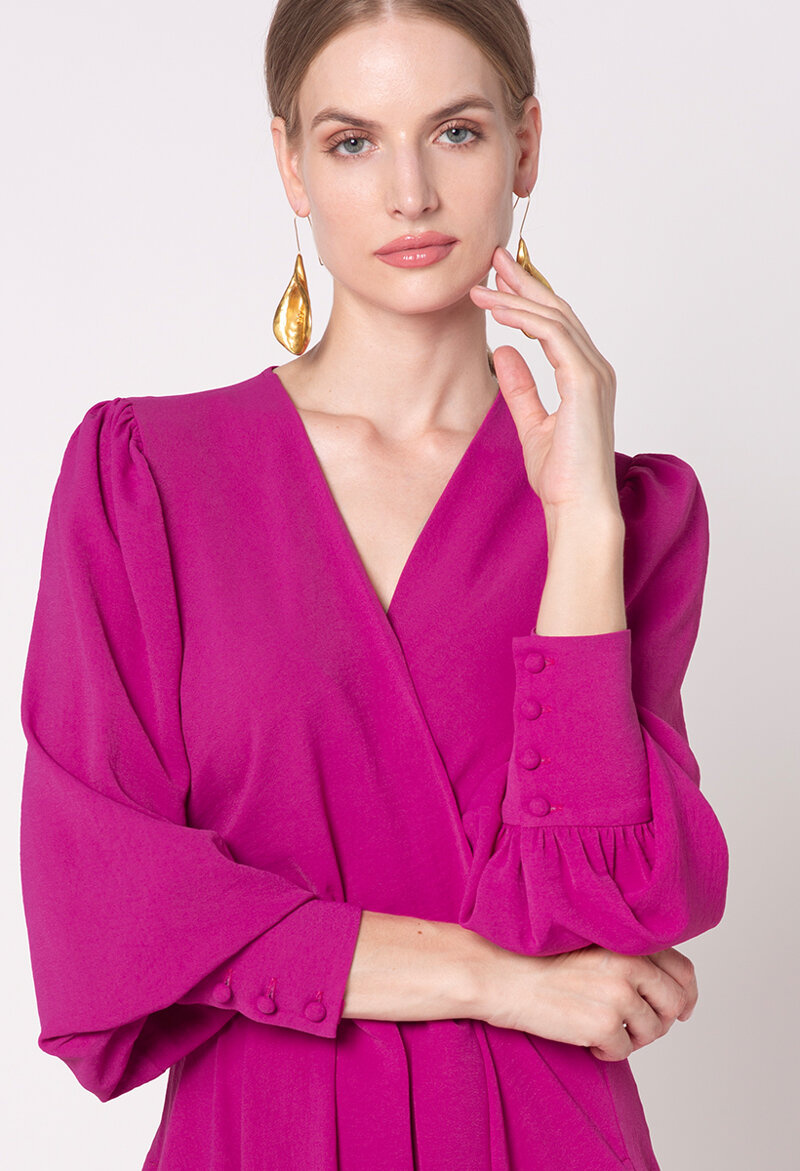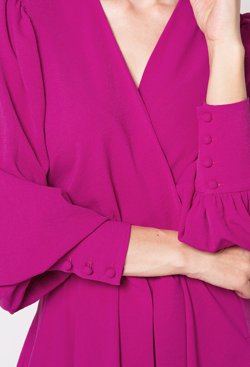 Sukienka posiada długie rękawy, które dodają klasy i dostojności. Zakończone eleganckimi, szerokimi mankietami, zapinanymi na guziki.  Ten szczegół nadaje sukience pewnego rodzaju finezji i wyrafinowania.