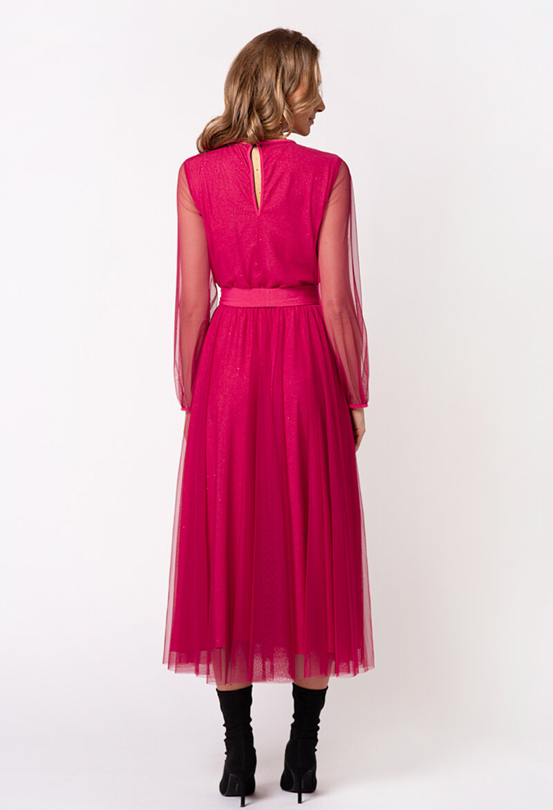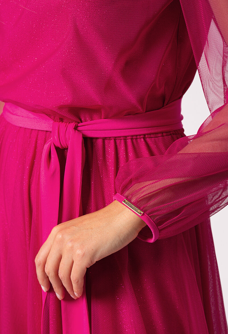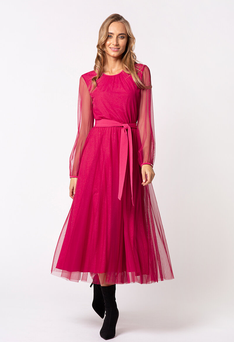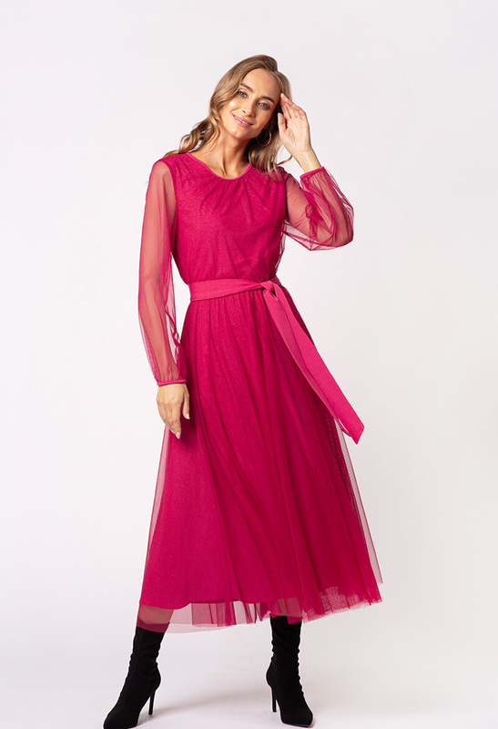 Wyjątkowy wybór na specjalne okazje. Jej unikalny design sprawi, że z pewnością będziesz się wyróżniać na każdym przyjęciu. Sukienka wykonana jest z delikatnej siatki, co nadaje jej lekkość i subtelny charakter. To idealny wybór dla kobiet ceniących wyrafinowany styl. Podszewką o połyskującym efekcie nadaje jej luksusowego wyglądu. Dzięki przezroczystym rękawom oraz rozkloszowanemu dołowi sukienki cała stylizacja zyskuje na delikatności i subtelności. Ruchomy materiał subtelnie unosi się podczas poruszania, co nadaje sukience jeszcze bardziej zmysłowego charakteru. To uniwersalny fason, który pasuje do różnych sylwetek i typów urody.