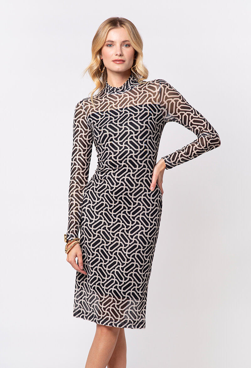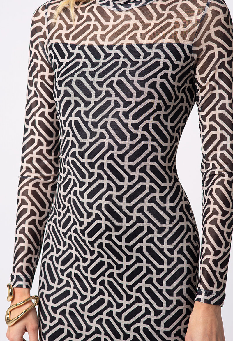 Zachwyca swoją prostotą i wyrafinowaną elegancją. Jej klasyczny fason doskonale podkreśla kobiece kształty, nadając stylizacji niepowtarzalny urok. Wykonana z delikatnej siatki emanuje subtelnością i wyjątkowym urokiem. Wzory na sukience dodają jej niezwykłego charakteru. Geometryczne motywy, które subtelnie ozdabiają całą powierzchnię sukienki. Długość sukienki tuby jest klasyczna, sięgająca do kolan, co sprawia, że jest ona odpowiednia na wiele różnych okazji.