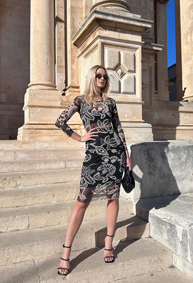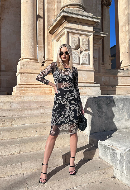 Prosta, a zarazem wyjątkowa. Zakrywa, a jednocześnie subtelnie odkrywa. Wyróżnia się swoim unikalnym stylem i wdziękiem. Wykonana z delikatnej czarnej siatki w kwiatowy wzór w kolorze ecru, ta sukienka z pewnością przyciągnie uwagę swoim urokiem. Przezroczyste rękawy, dekolt, okolice talii oraz dół sukienki dodają lekkości i delikatności, podkreślając zmysłowość całego projektu. To doskonały wybór na wiele różnych okazji - od eleganckich przyjęć po romantyczne kolacje, a nawet casualowe stylizacje. Jej uniwersalny design sprawia, że będzie doskonale prezentować się na każdej sylwetce, podkreślając kobiece kształty i dodając pewności siebie.