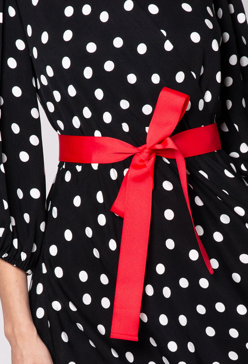 • Sprzedawana w zestawie z dwoma paskami, czerwonym oraz z tej samej tkaniny co sukienka.