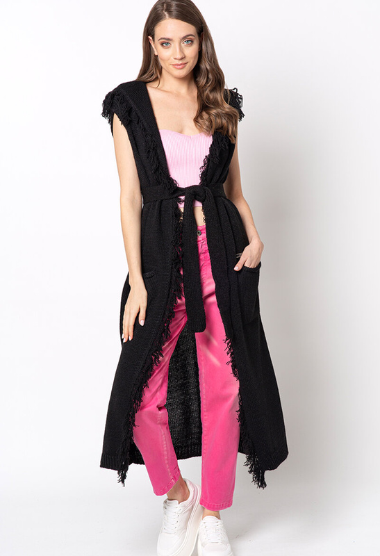Długa czarna dzianinowa kamizelka z frędzlami Malmo