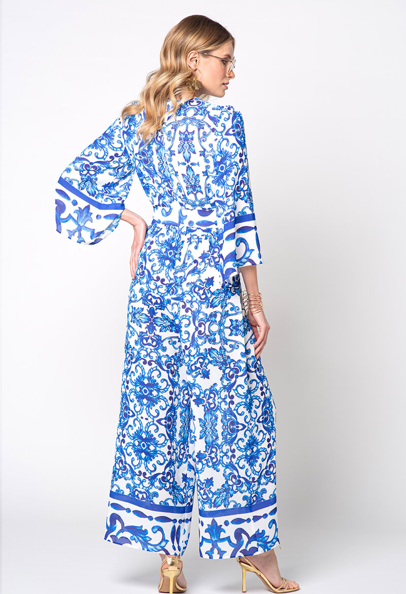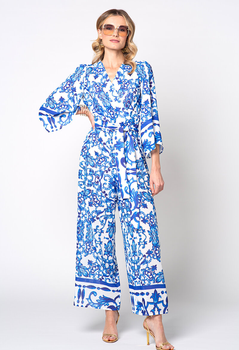 Ubieraj się tak jakby cały świat był Twoim wybiegiem pokazu mody, a Ty główną gwiazdą. Ten kombinezon to prawdziwy majstersztyk wyrafinowanego stylu. Modny wzór podkreśla oryginalność. Lekko peźroczysta tkanina nadaje lekkości. Dla Twojego komfortu wyposażony został w podszewkę w postaci krótkich spodenek. Trapezowe rękawy o długości 3/4 nadają mu subtelnego uroku, dodając delikatności całej stylizacji. Kopertowy dekolt podkreśla zmysłowość stylizacji, dodając elegancji i kobiecości. Wyposażony w pasek w talii, wykonany z tego samego materiału. Możesz go zawiązać na kokardę lub luźniej przewiązać, dostosowując się do okazji. Szerokie, długie nogawki kombinezonu zapewniają swobodę ruchu i dodają charakteru. Idealnie komponują się z każdym rodzajem obuwia, od eleganckich szpilek po wygodne sandały.