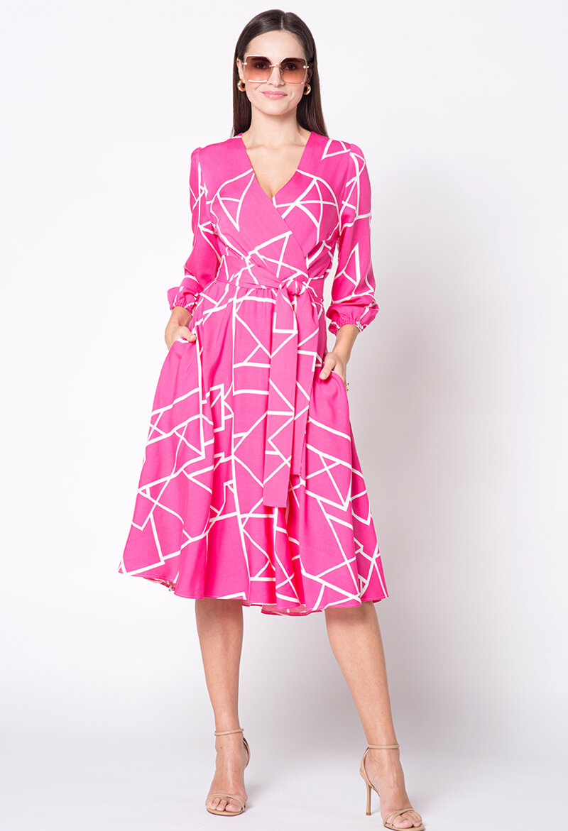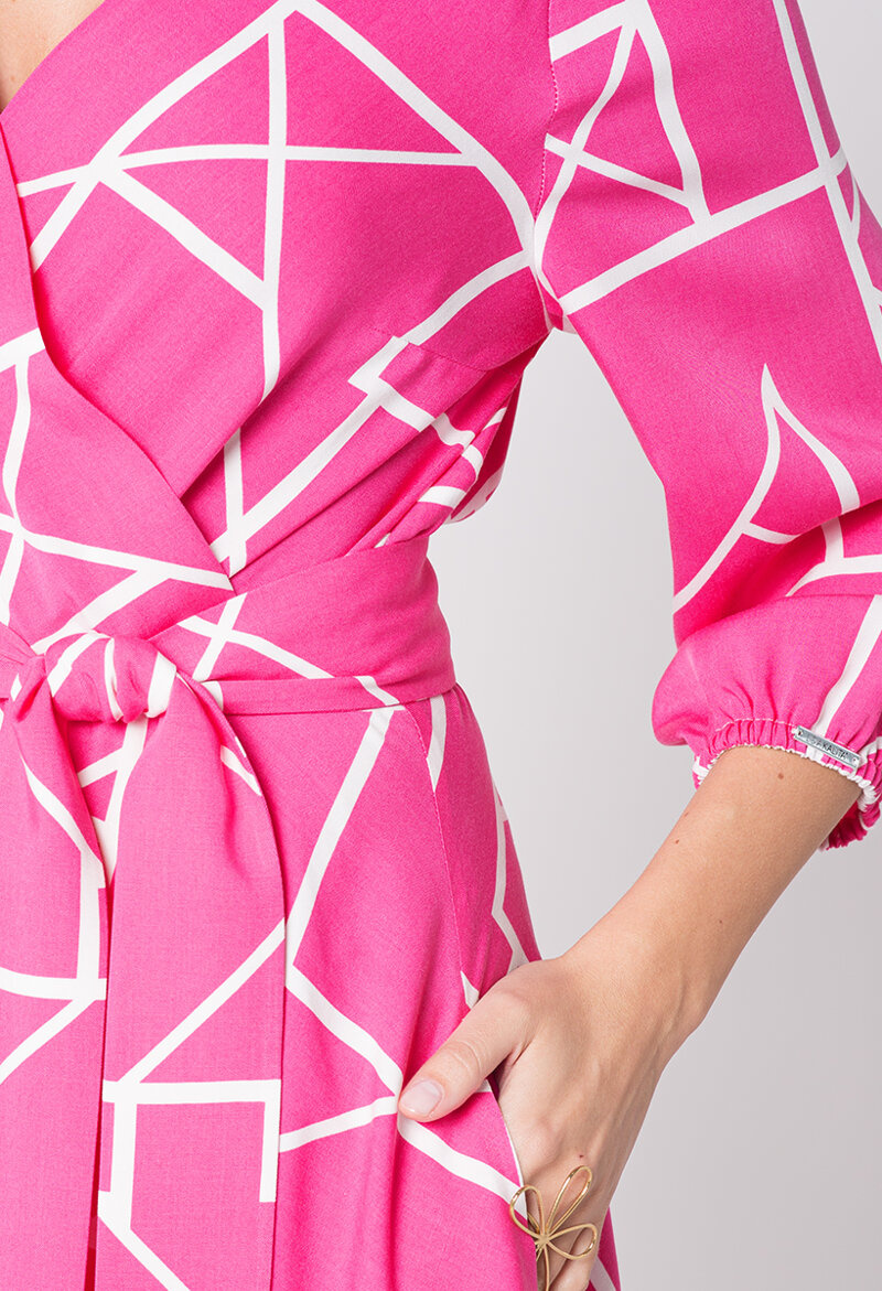 Sukienka Calais ma długość za kolano, co nadaje jej klasyczny i stylowy wygląd. Jest wykonana z wysokiej jakości wiskozy, dzięki czemu fantastycznie układa się na sylwetce. Kopertowy dekolt dodaje jej kobiecości i subtelności. Wyposażona w pasek w talii, z tego samego materiału, który podkreśla kobiecą sylwetkę. Charakteru dodaje jej efektowny wzór. Rozkloszowany dół sukienki gwarantuje efektu WOW i pięknie prezentuje się w ruchu.