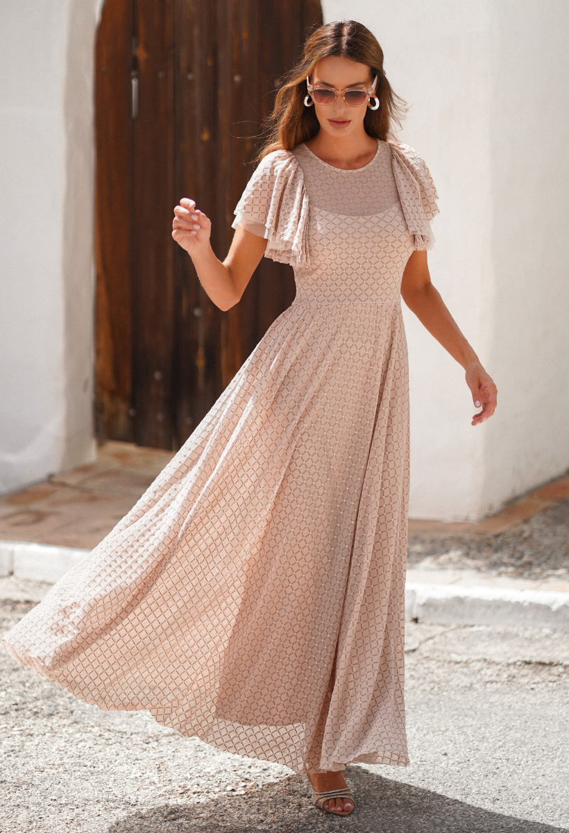 Zachwyca swoim kobiecym krojem i wyjątkowymi detalami. Sukienka łączy w sobie elementy klasycznej elegancji z nutką romantyzmu. Jej rozkloszowany dół nadaje ruchu i lekkości podczas każdego kroku, podkreślając subtelnie kobiecą sylwetkę. Z kolei dopasowana góra oraz krótkie rękawy z warstwowymi falbanami dodają charakteru i delikatności całej stylizacji. Wykonana z lekko przezroczystej siatki w jasnym odcieniu beżu emanuje delikatnym urokiem i subtelnością. Błyszczące na srebrno wzory dodają jej wyjątkowego blasku, sprawiając, że każda kobieta poczuje się wyjątkowo. Aby zapewnić pełen komfort noszenia, ta długa sukienka została wyposażona w podszewkę z przyjemnego dla ciała materiału. Okrągły dekolt sukienki doskonale komponuje się z jej delikatnym charakterem, podkreślając szyję i dekolt w sposób subtelny i elegancki.