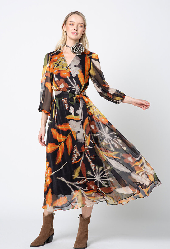 Czarna szyfonowa sukienka w pomarańczowe kwiaty Portobello