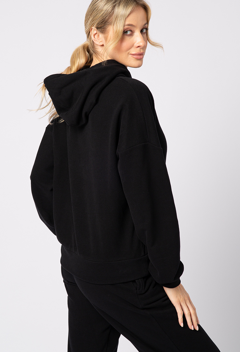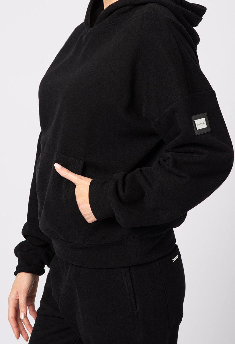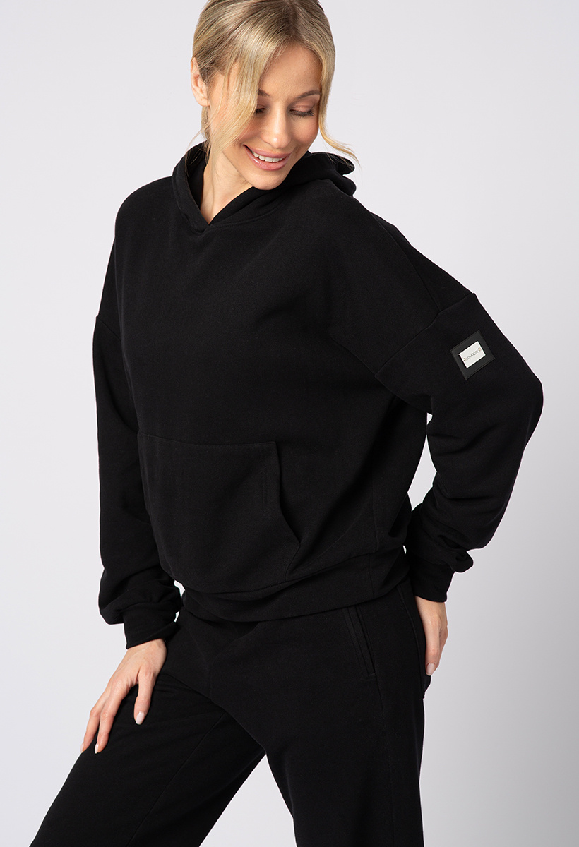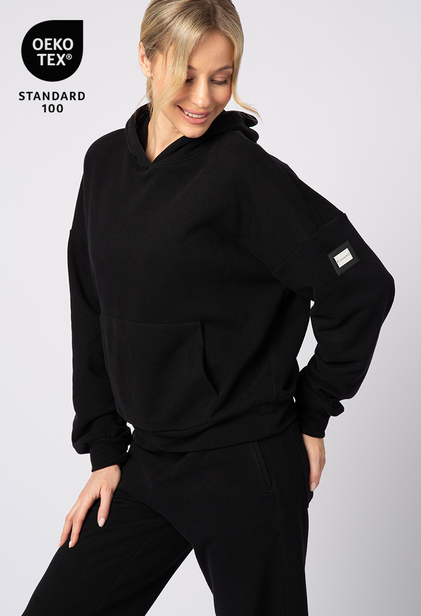 Minimalizm, który zawsze się sprawdza. Bluza z kapturem w czarnym kolorze to klasyczny niezbędnik w każdej garderobie. Wykonana w 100% z certyfikowanej bawełny (OEKO-TEX Standard 100). Dzięki czemu zarówno przędza, jak i wykończenie gwarantują najwyższą jakość i bezpieczeństwo. W procesie produkcji dzianina jest enzymowana, co zapobiega mechaceniu, oraz silikonowana, dzięki czemu zyskuje szlachetny połysk i delikatne rozświetlenie. Praktyczna kieszeń z przodu dodaje funkcjonalności, a uniwersalny krój sprawia, że świetnie komponuje się z każdą stylizacją – od casualowych zestawów po sportowy look. Idealna na co dzień, do relaksu i aktywności.