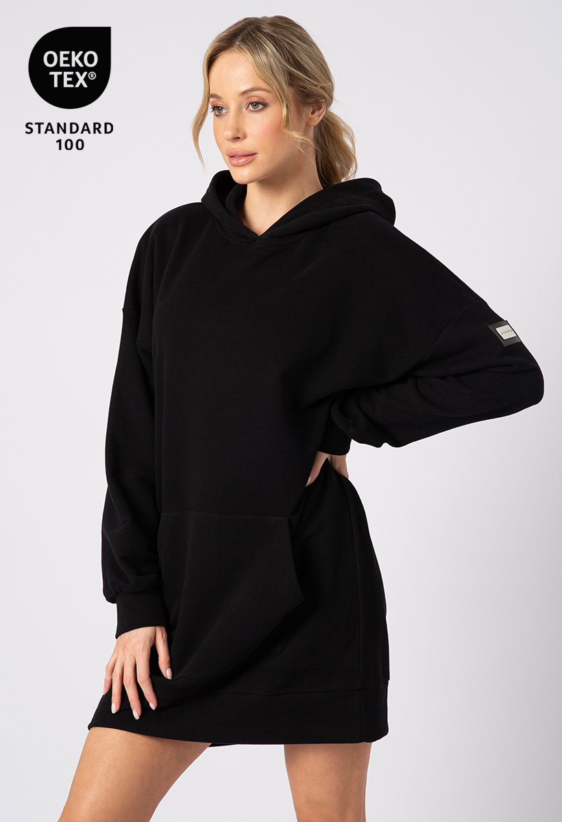 Styl, wygoda i wszechstronność w jednym. Długa czarna bluza z kapturem to must-have, który dopasuje się do każdej stylizacji. Jeśli jeszcze nie masz takiej bluzy w swojej szafie, czas to zmienić – szybko przekonasz się, jak bardzo jej potrzebujesz. Wyposażona w praktyczną kieszeń z przodu, sprawdzi się zarówno w zestawie ze spodniami czy legginsami, jak i jako sportowa sukienka. Wykonana w 100% z certyfikowanej bawełny (OEKO-TEX Standard 100), gwarantuje miękkość, komfort i jakość na najwyższym poziomie. W procesie produkcji dzianina jest enzymowana, co zapobiega mechaceniu, oraz silikonowana, dzięki czemu zyskuje szlachetny połysk i delikatne rozświetlenie.