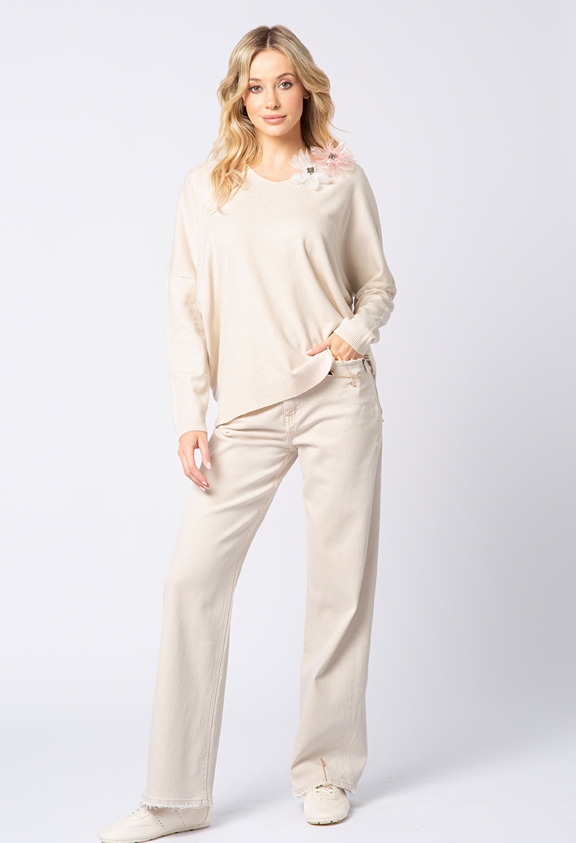 Jeansowe beżowe spodnie z ozdobnymi agrafkami