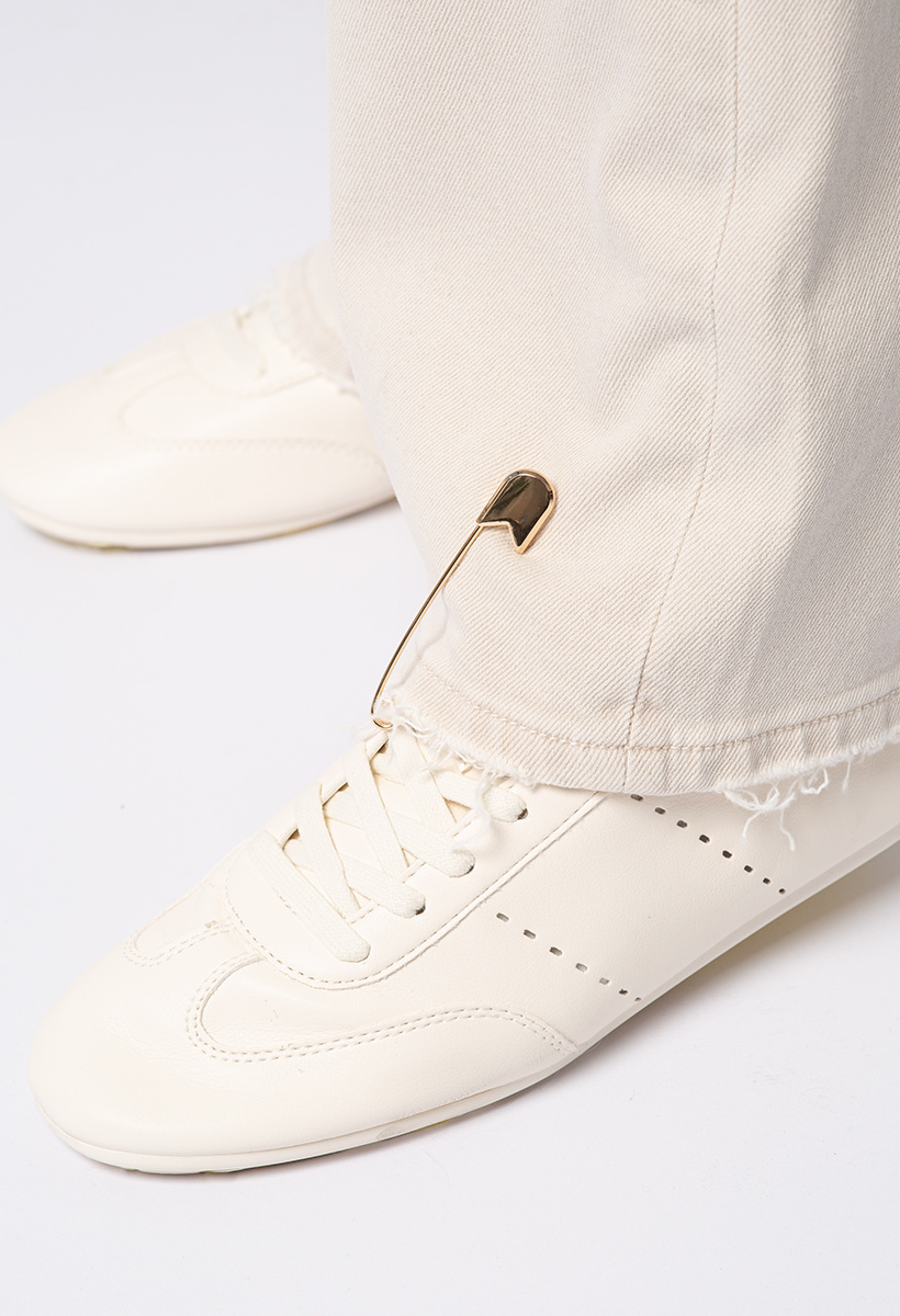 Klasyka denimu w nowoczesnym wydaniu. Beżowe jeansowe spodnie z szerokimi nogawkami to idealna propozycja dla kobiet ceniących wygodę i ponadczasowy styl. Wysoki stan pięknie podkreśla talię i optycznie wydłuża nogi, a luźny fason zapewnia swobodę ruchów. Charakteru nadają im złote agrafki umieszczone przy kieszeni z przodu oraz na nogawce, które dodają całości nieco zadziornego, modowego akcentu. Doskonałe do codziennych stylizacji – świetnie komponują się zarówno z dopasowanym topem, jak i oversizowym swetrem, bluzą czy marynarką.