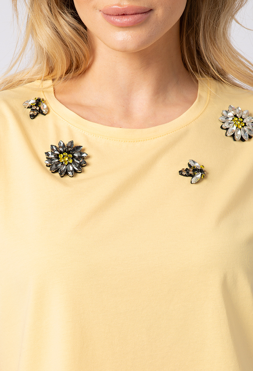 Żółty t-shirt z pszczółkami i kwiatkami kryształowymi