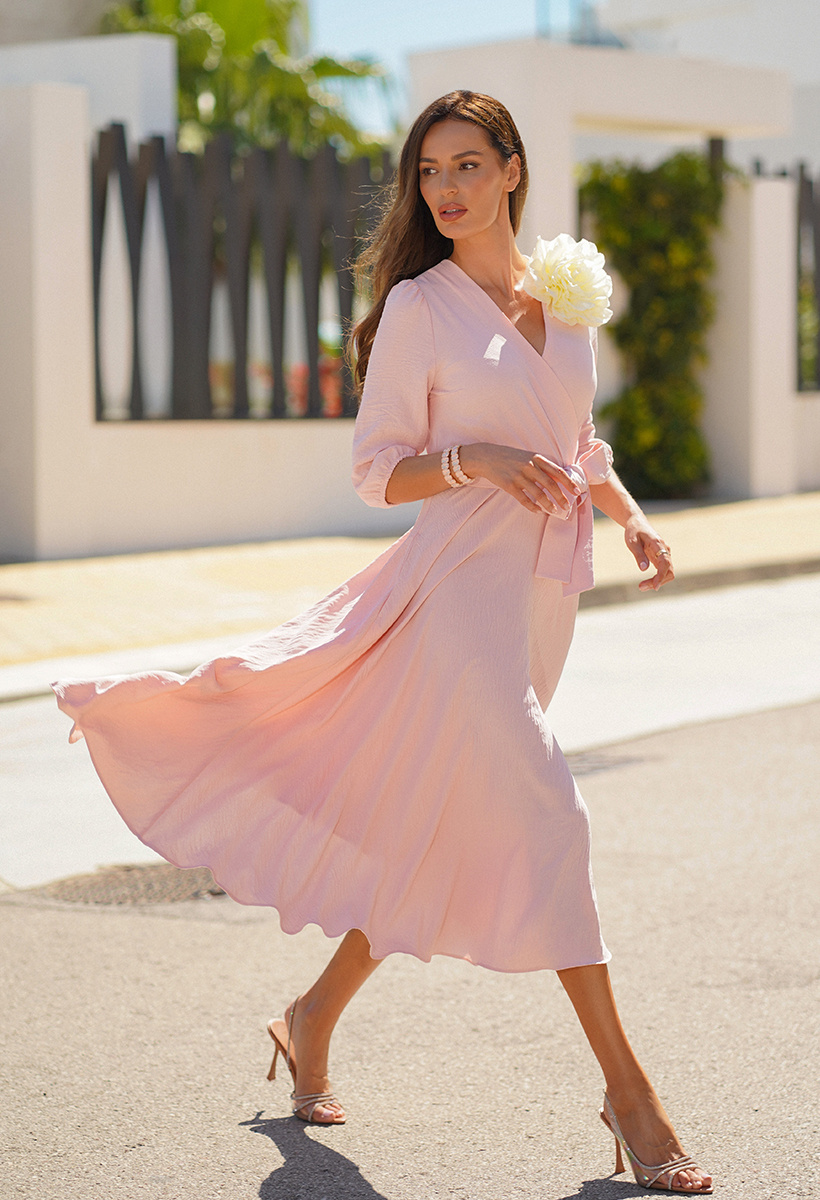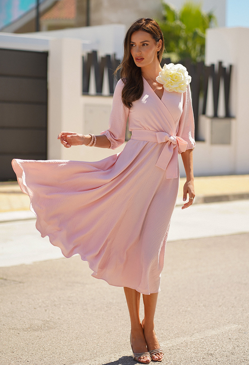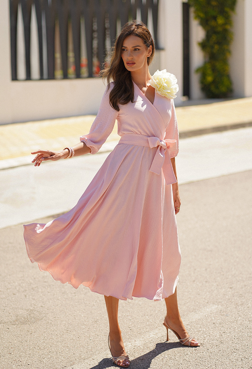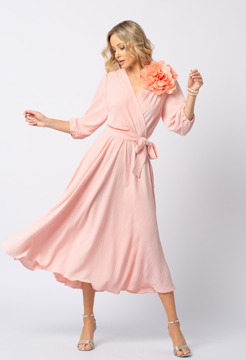 • Jeśli lubisz ponadczasowe, uniwersalne fasony i kolory to ta sukienka jest właśnie dla Ciebie. Klasyczny krój, kopertowy dekolt, rozkloszowana spódnica. Wyjątkowym atutem tej sukienki są kieszenie. Kwiat - broszka sprzedawany jest oddzielnie.
